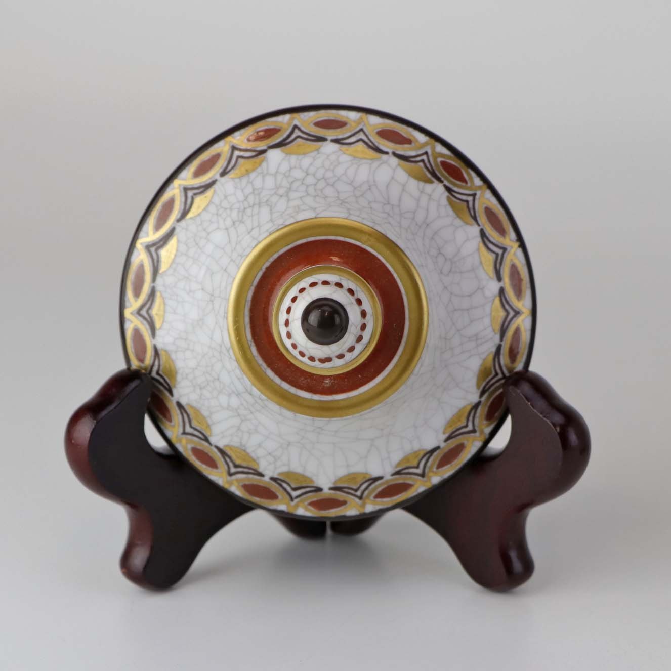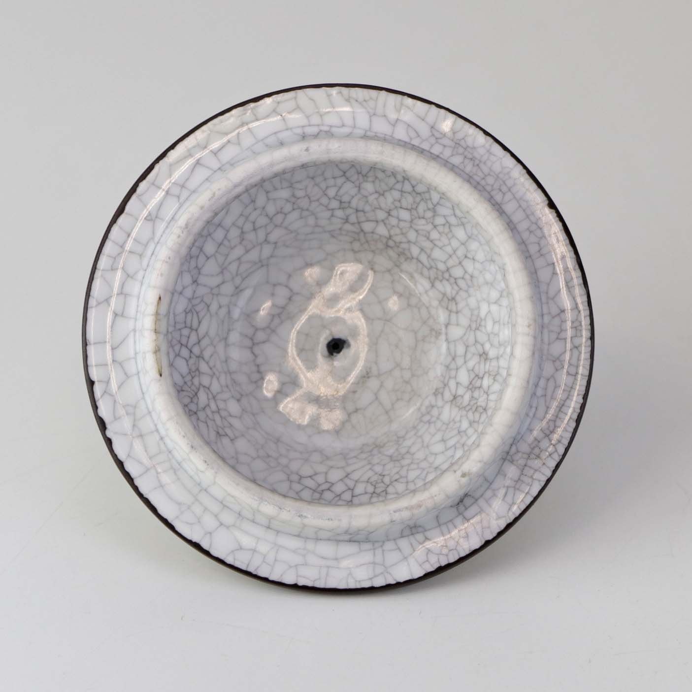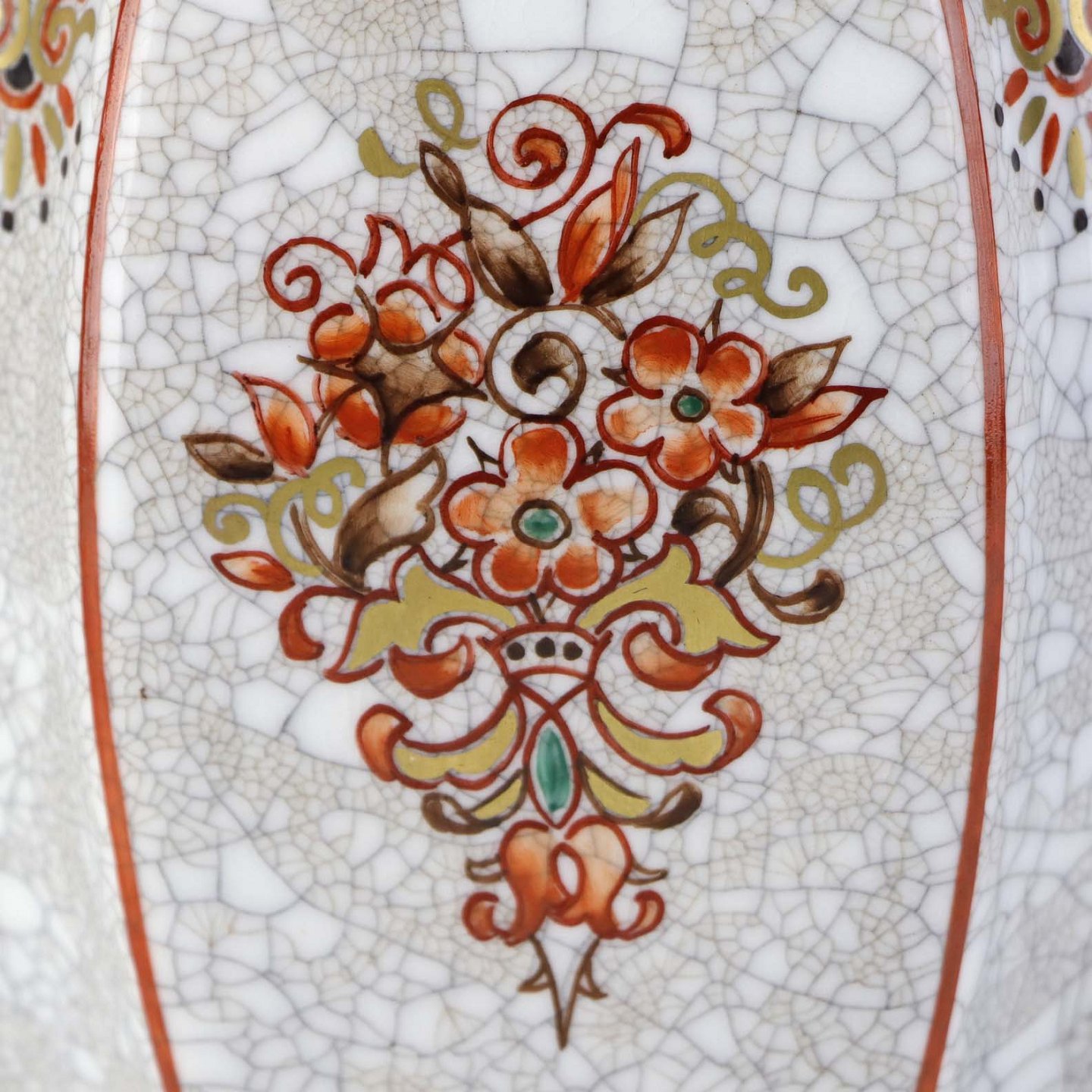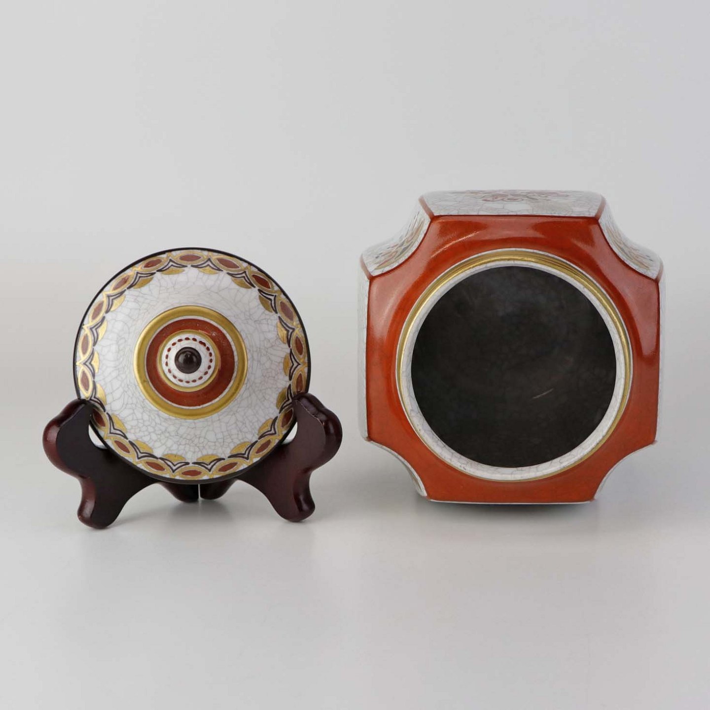 Text zugänglich auf Dänische: Kantet krukke med låg i porcelæn med krakele glasur og motiv af blomster samt kantet med orangerød bort og guld kant. Nr. 196/600