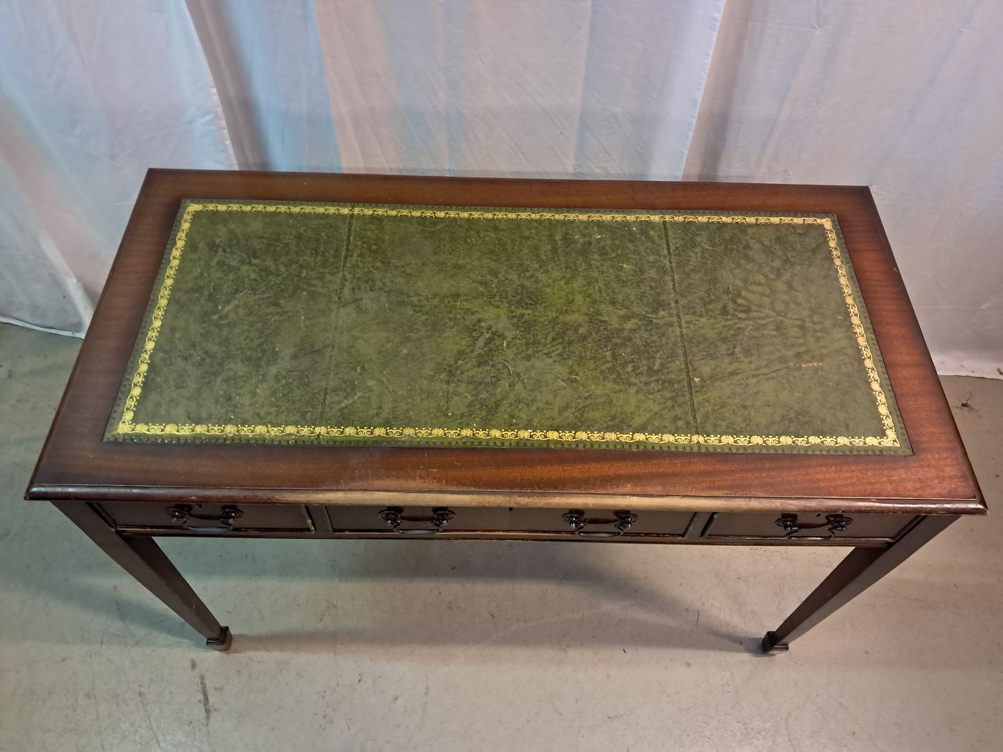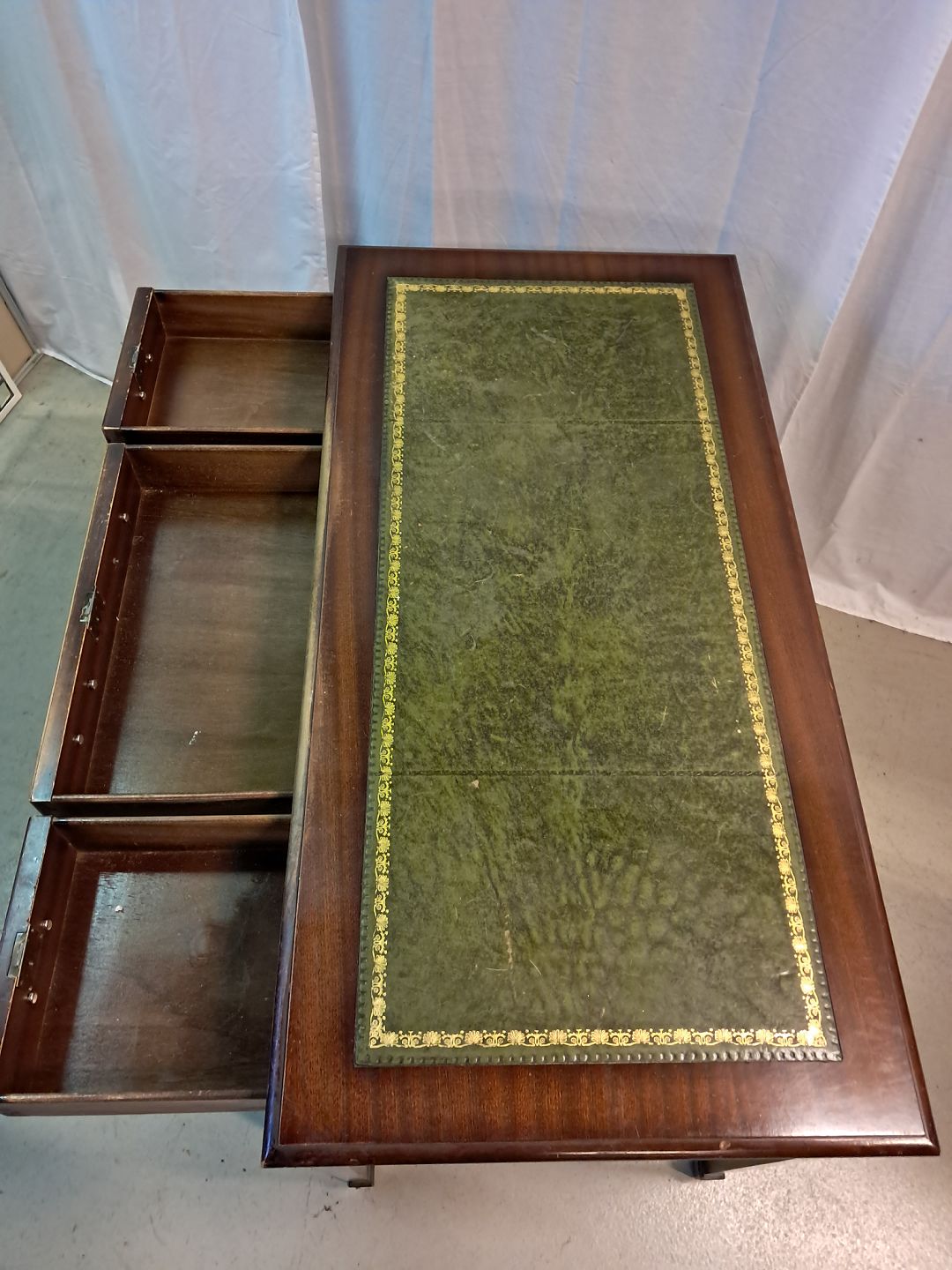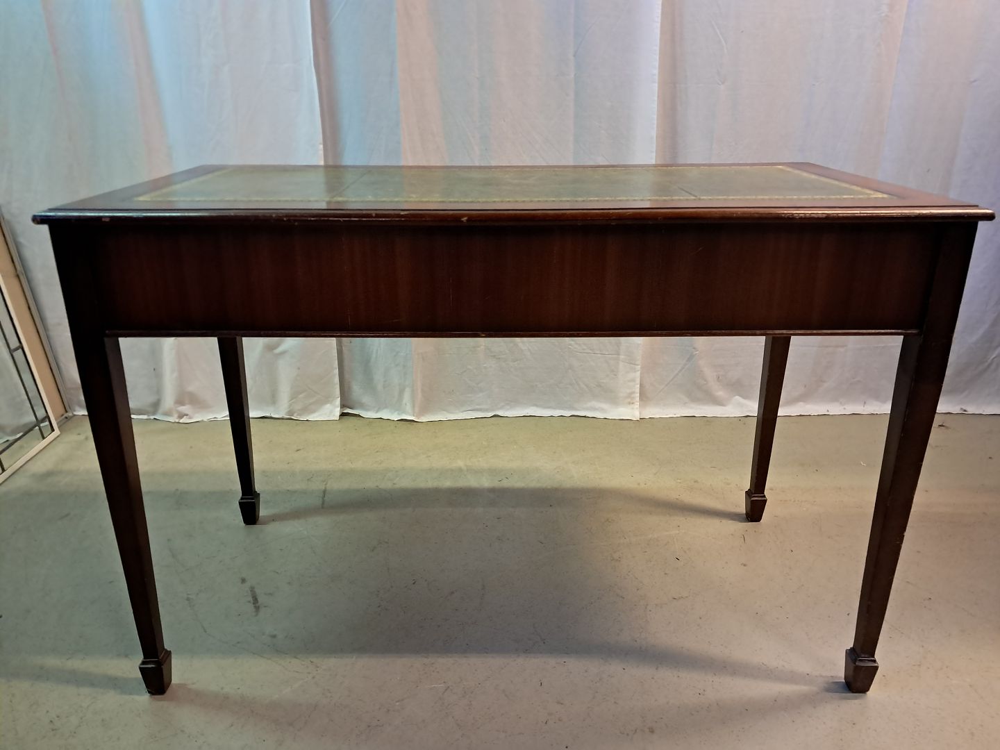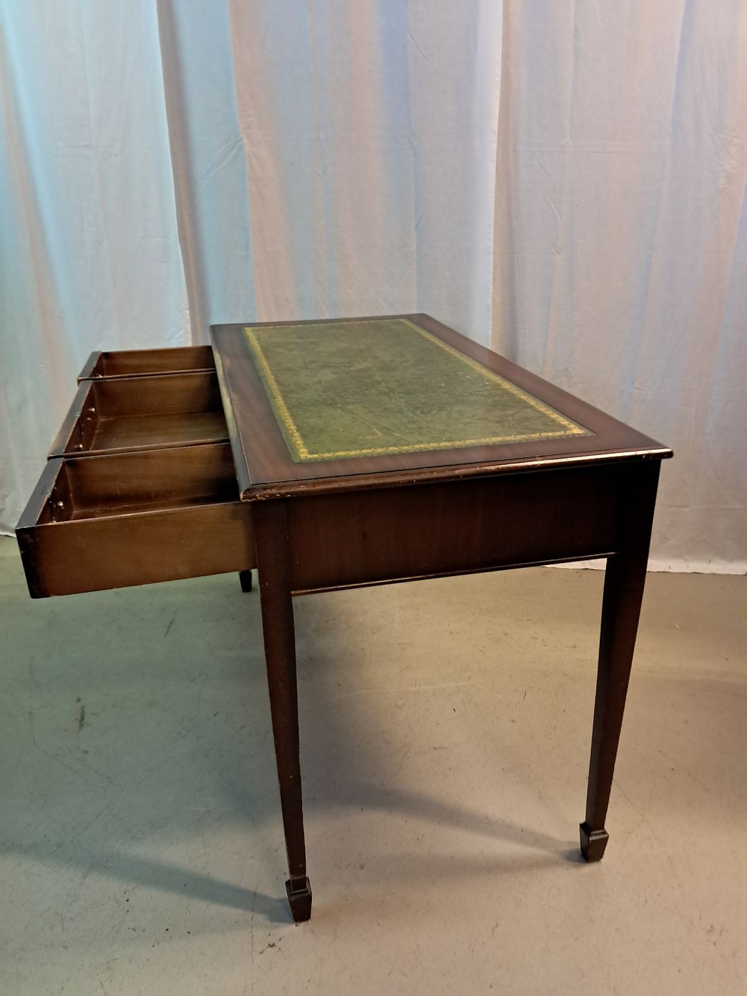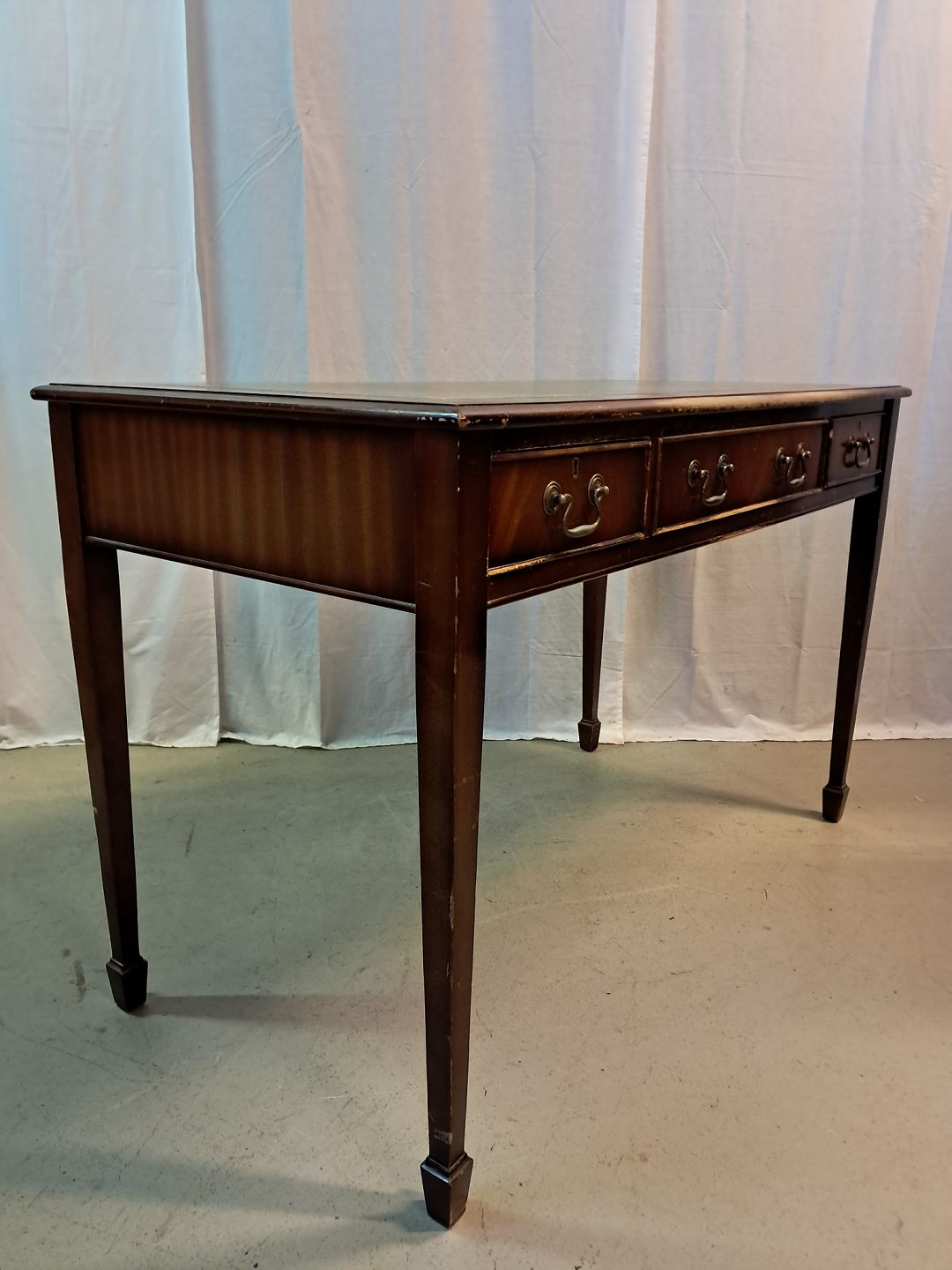 Skrivebord i fineret mahogni med læder indlæg, fra 1980erne.