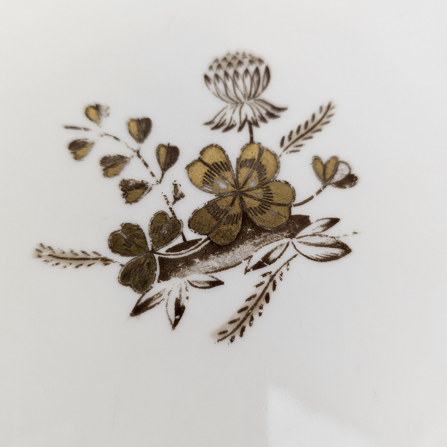 Cremefarvet porcelæn med motiv af gylden kløverblomst og bred graveret guldkant