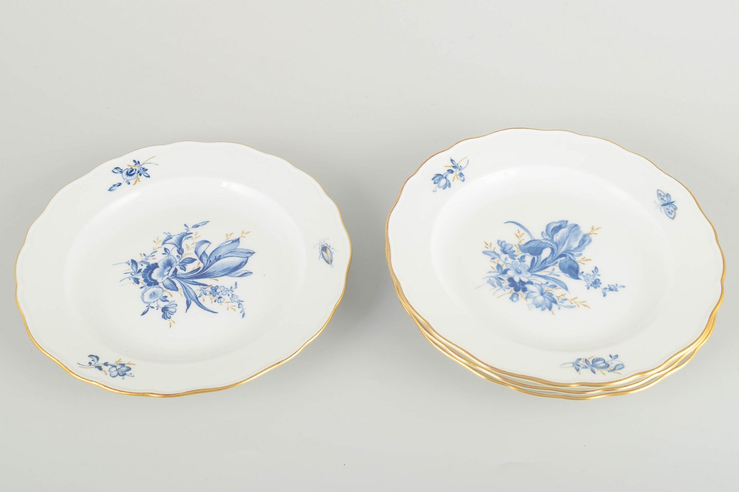 Hånddekoreret porcelæn med håndmalede blå blomsterdekorationer og forgyldte stafferinger langs kanten. Klassisk let bølget form.