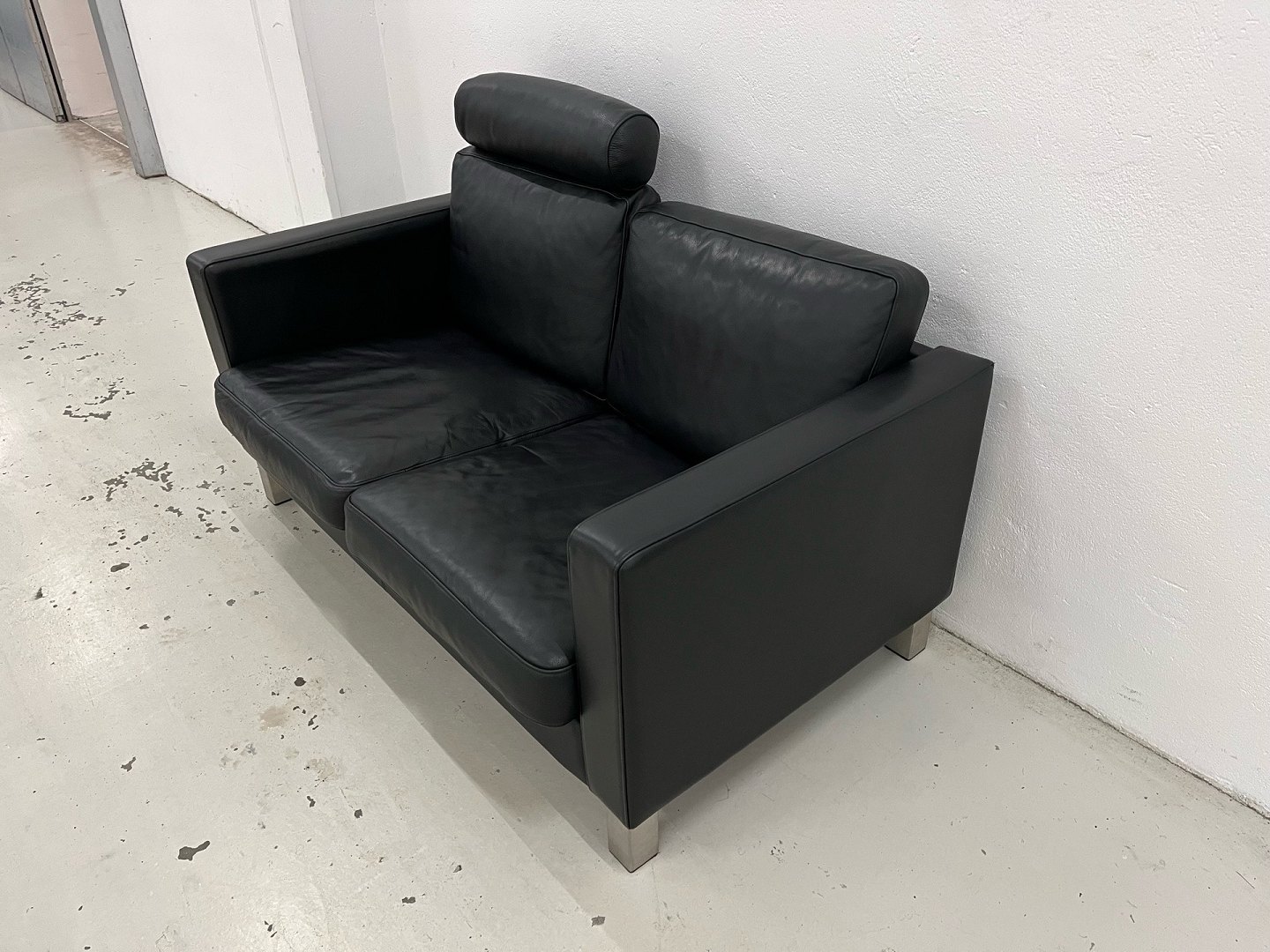 Mogens Hansen MH321 2-Sitzer-Sofa in schwarzem Prestige-Leder und mit Beinen aus gebürstetem Stahl. Neupreis 35.403,-. Das Sofa ist gereinigt und lederbehandelt und in wirklich schönem Zustand, einschließlich 1 Nackenkissen. Das Sofa hatte einen Besitzer und stammt aus einem tier-/rauchfreien Haushalt. PS hat auch ein 3-Sitzer-Sofa des gleichen Modells auf Lager. Schönes 2-Sitzer-Sofa im klassischen Designs von Mogens Hansen. Das Sofa ist mit einem daunengefüllten Sitzeinsatz ausgestattet, der genau den richtigen Komfort und die richtige Optik bietet. Da das Sofa in einem leichten und einfachen Design gebaut ist, wirkt es in einem Wohnzimmer nicht schwer, sondern eher leicht, schön und mit einer fantastischen Haltbarkeit, die der Verwendung durch die ganze Familie standhält. Das Sofa wird in Mogens Hansens eigener Fabrik in Aarhus hergestellt, wo alle Komponenten der Möbelproduktion in Dänemark hergestellt werden und hohen Umweltstandards entsprechen. Mit einem Sofa von Mogens Hansen investiere