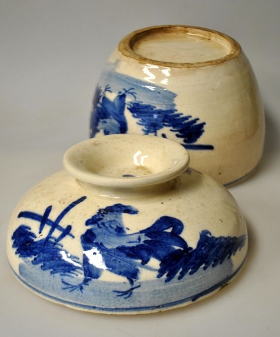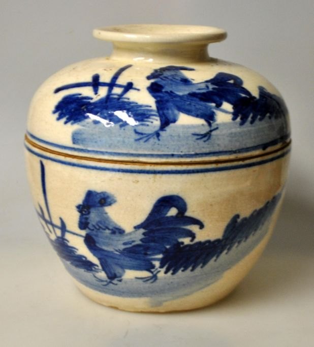 Chinesische Speiseterrine mit Deckel, Fayence, 19. Jahrhundert. Blau dekoriert mit Hahn und Schild. H.: 19 cm. Durchmesser: 17 cm.