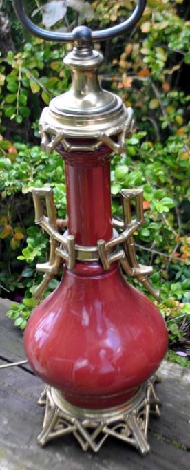 Französische Tischlampe, 19. Jahrhundert. Ehemalige Petroleumlampe, auf elektrisch umgerüstet. Bronze und Korpus aus ochsenblutfarbenem Porzellan. H.: 65 cm.