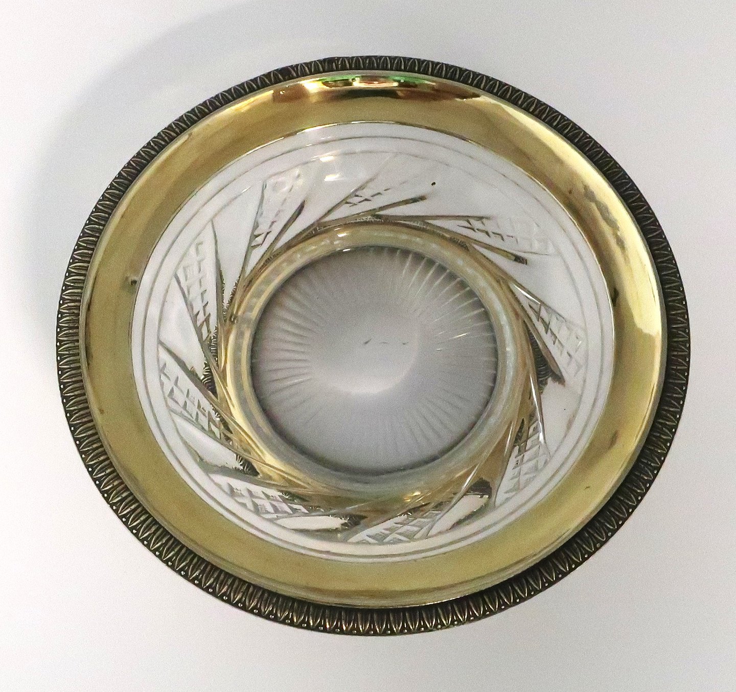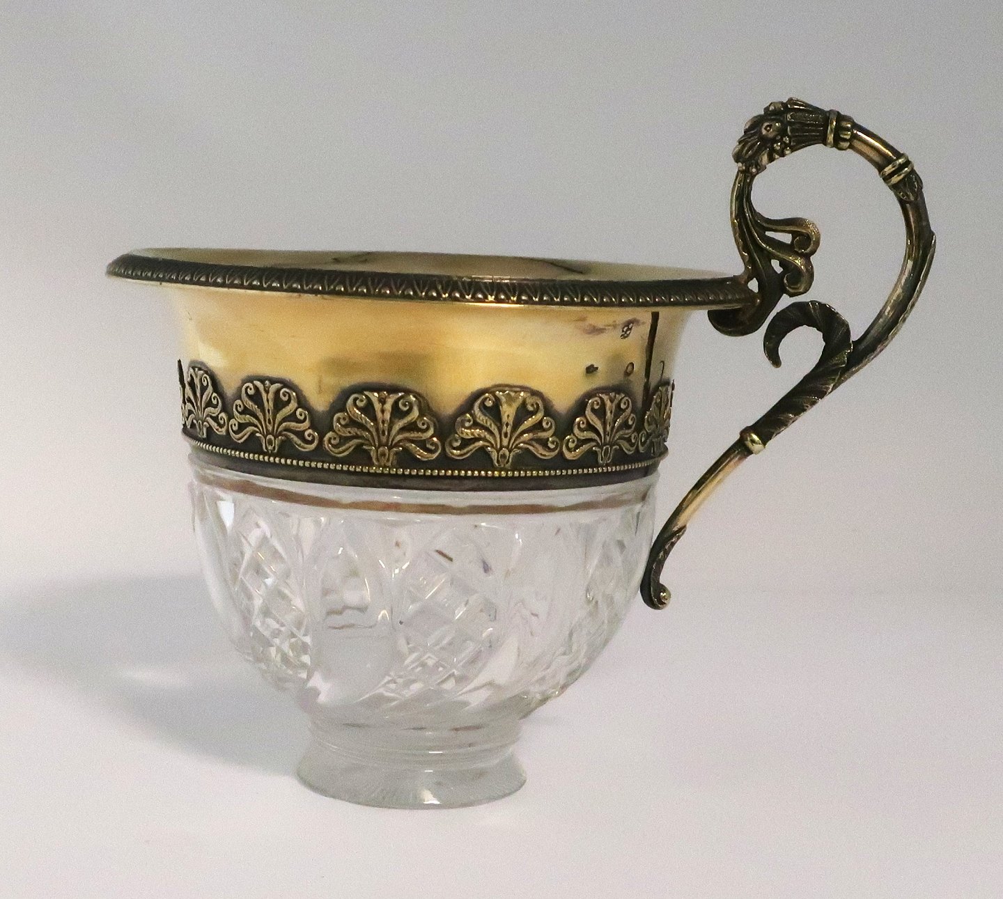 Französische Kristalltasse mit vergoldeter Silbermontierung. Tasse und Untertasse. Höhe 13 cm. Kleiner Stoss an der Tassenunterseite.