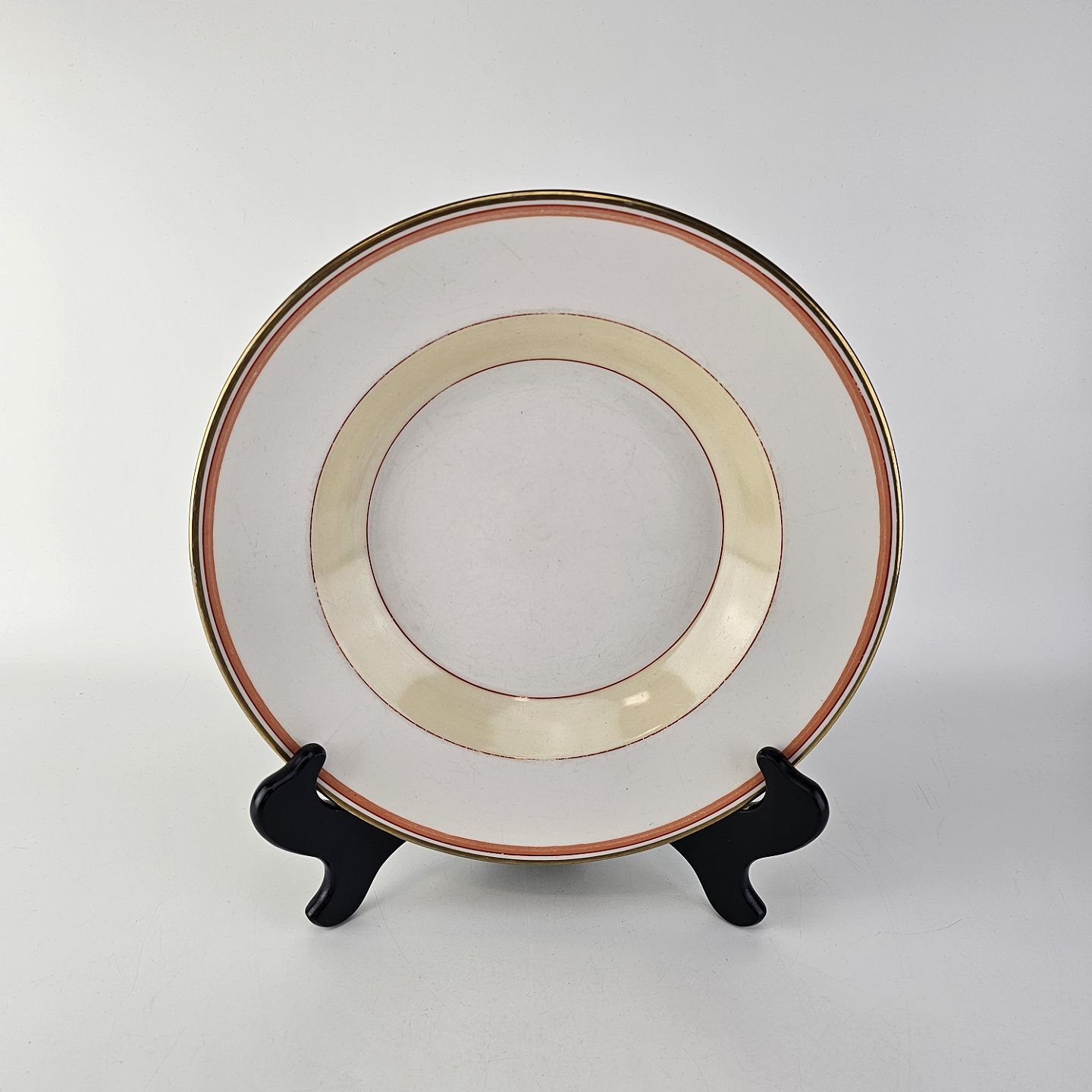 Service i glat hvidt porcelæn pyntet med dekoration i beige, brændt orange og gylden streg.