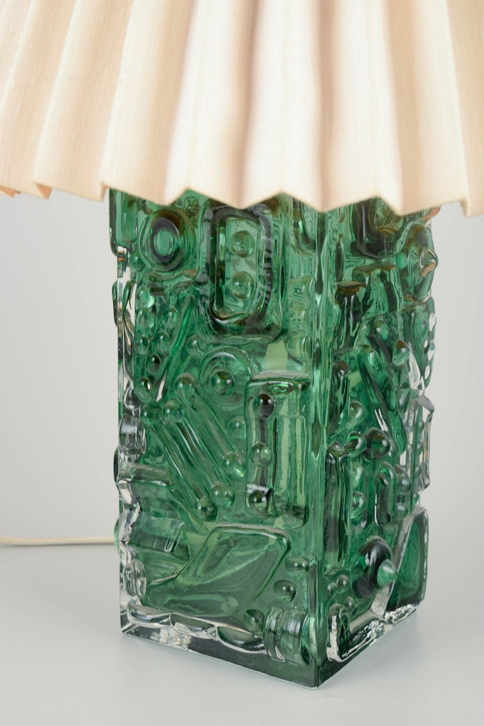 Rektangulær lampefod i kraftigt formblæst grønt glas med reliefdekorerede abstrakte mønstre og optiske effekter. Monteret med plisseret stofskærm.