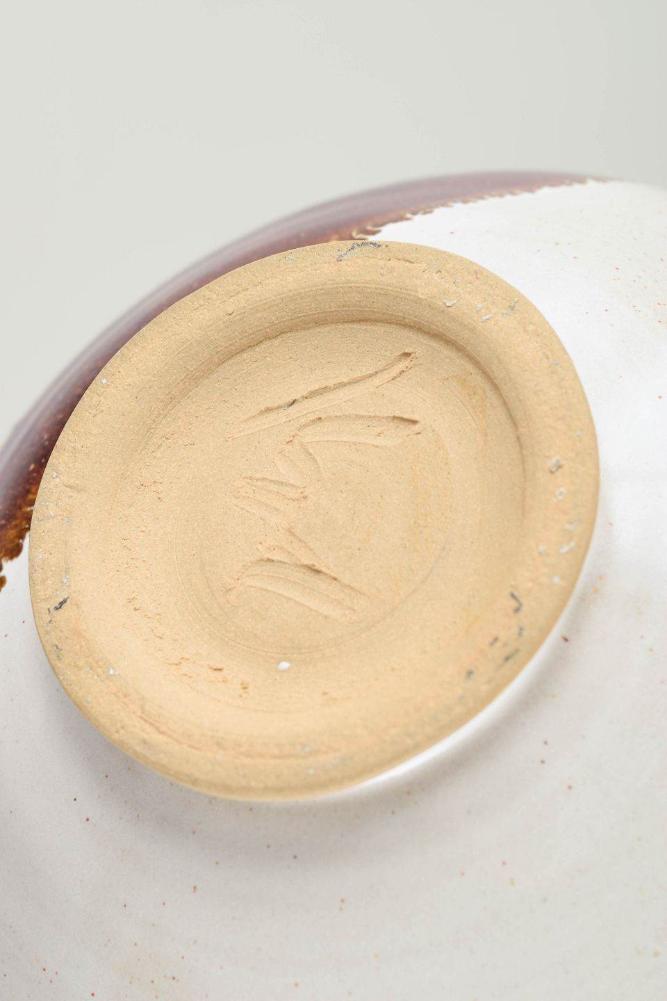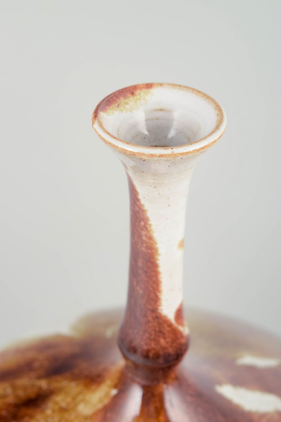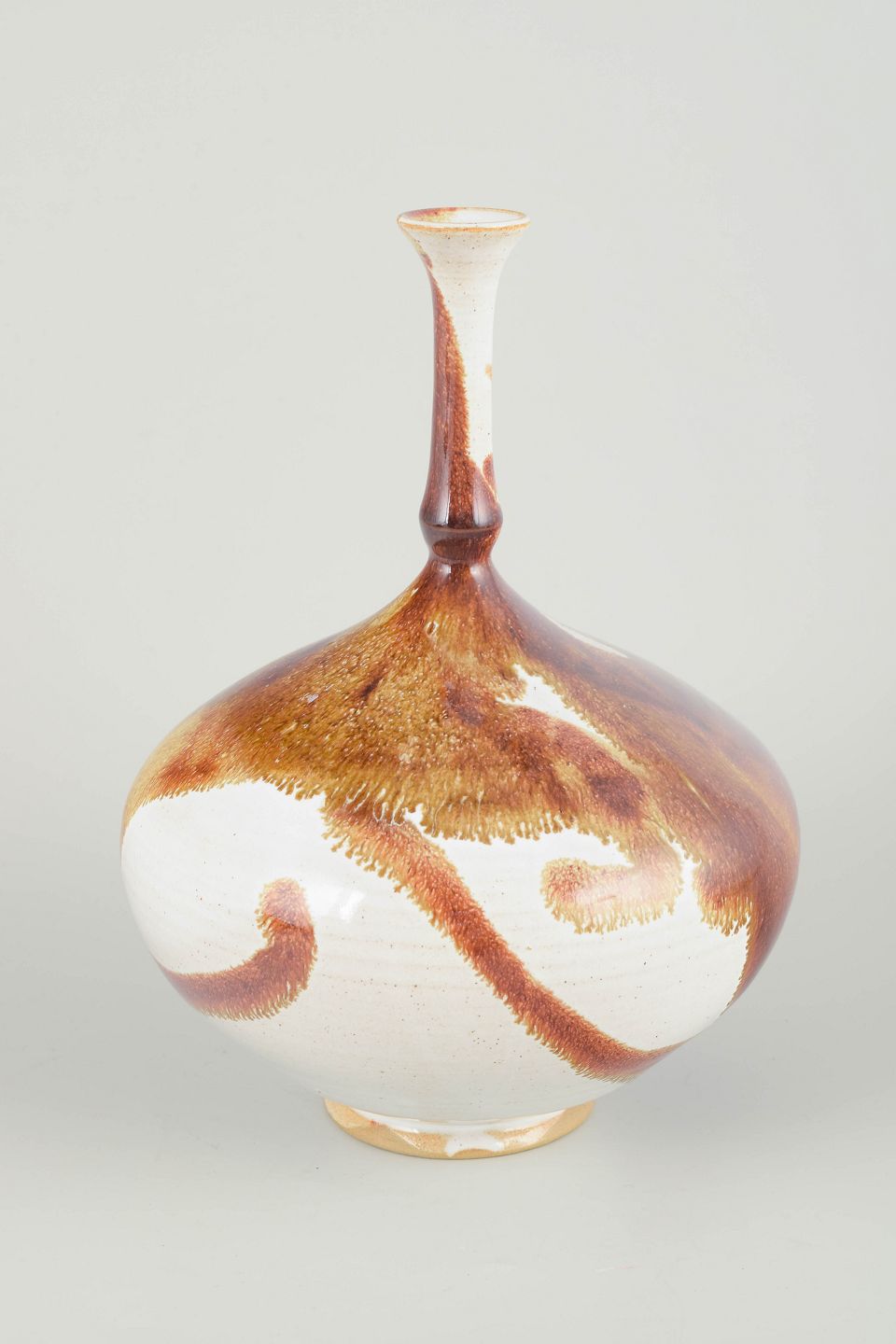 Hånddrejet stentøjsvase med høj slank hals og organiske brune glasurløb over råhvid bund. Unika vase, signeret af kunstneren.