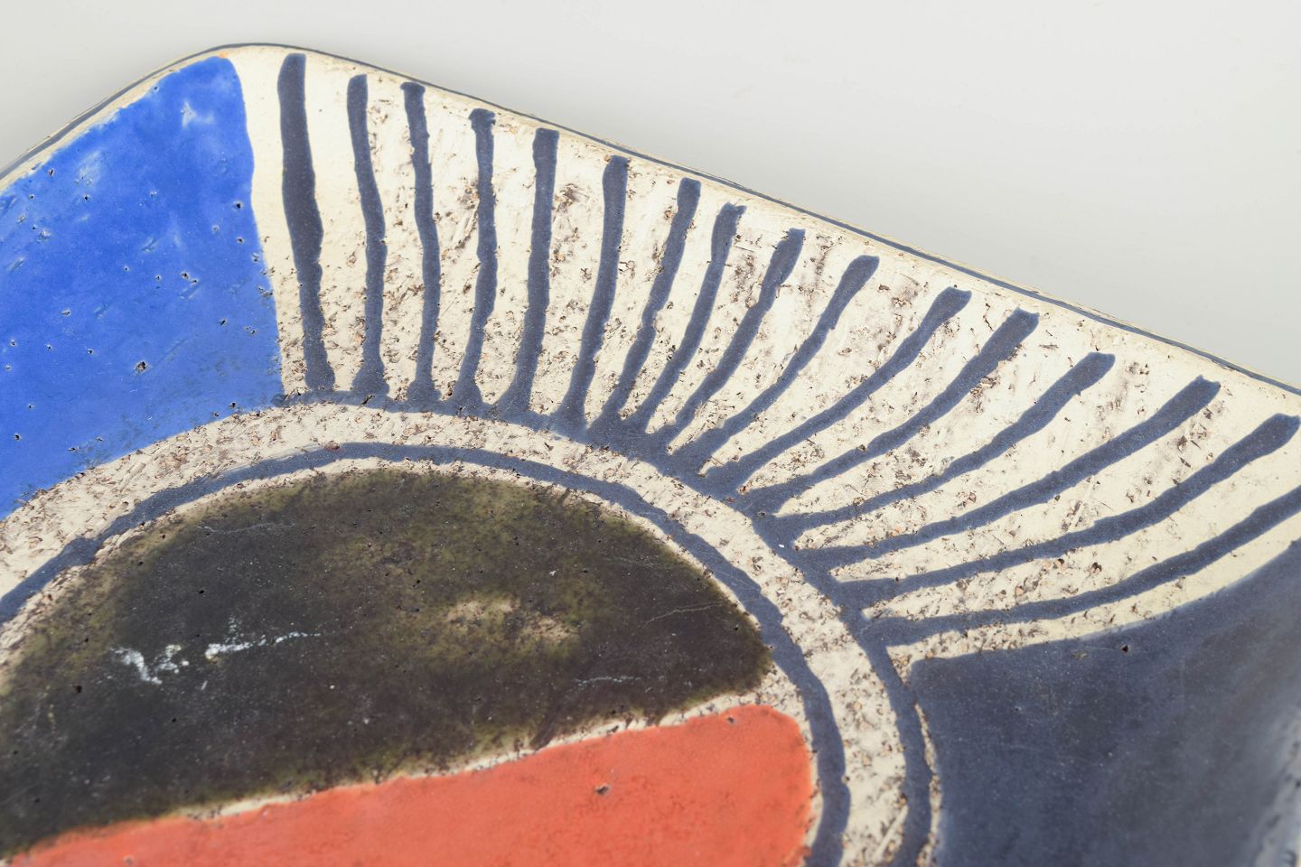 Rektangulær skål i stentøj med hånddekoreret konkret/geometrisk motiv i blå, sort, rød og hvid glasur. Let svungne kanter og lav kuvet form.