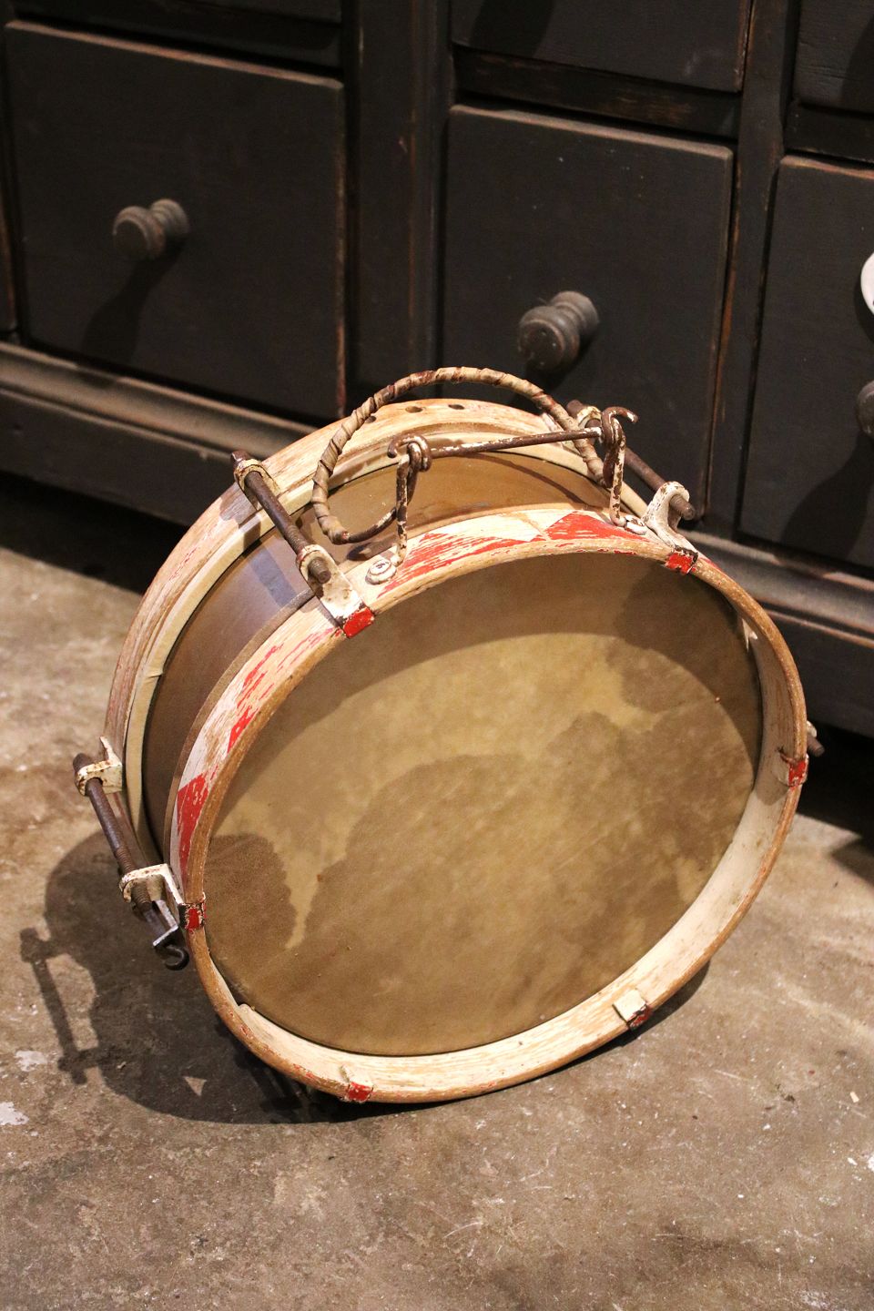 Dekorativ , gammel tromme i messing med malet træ kanter