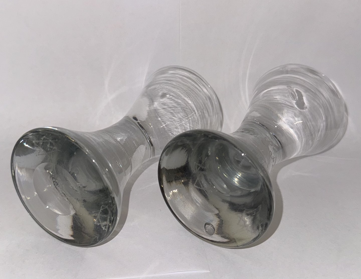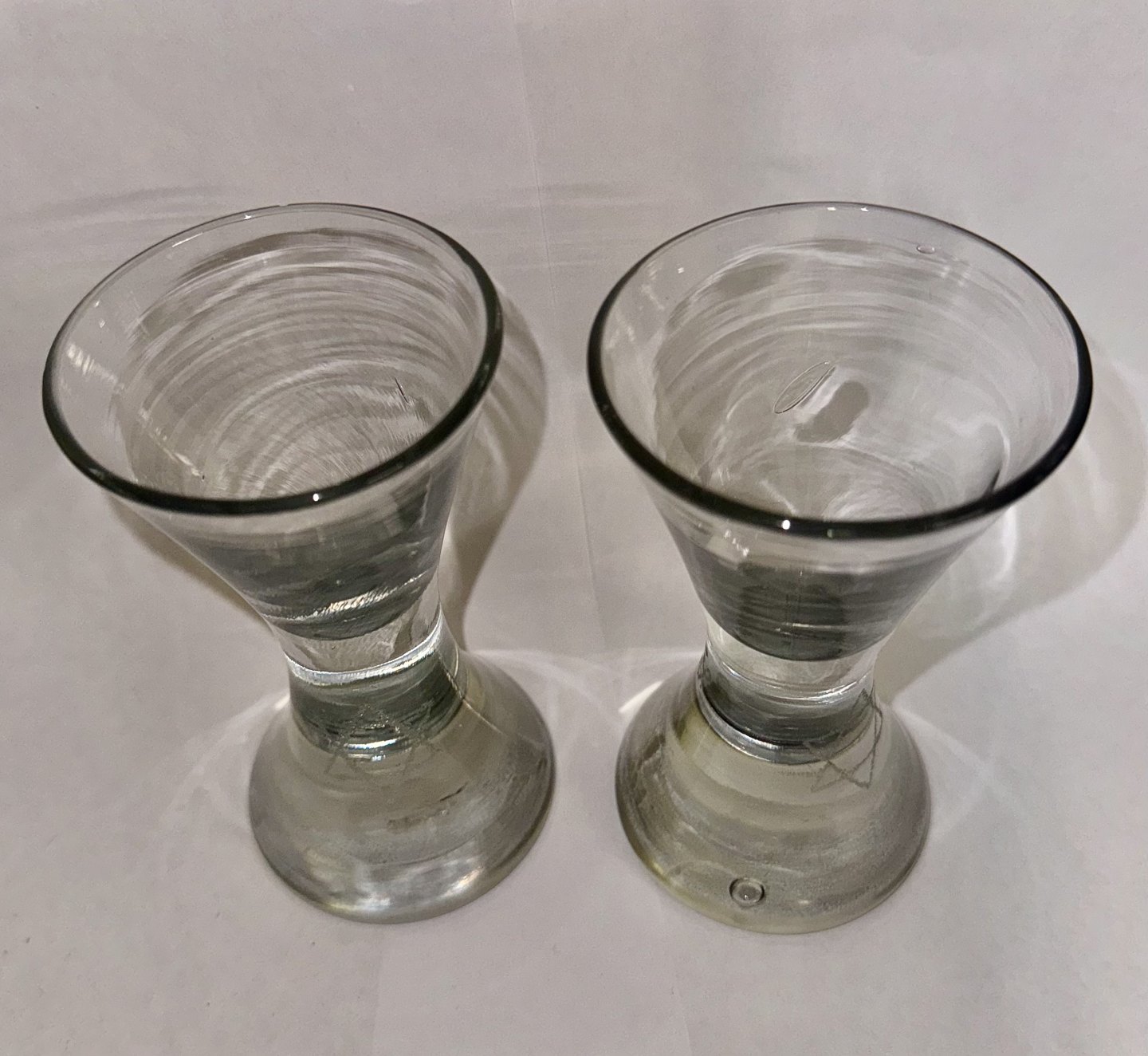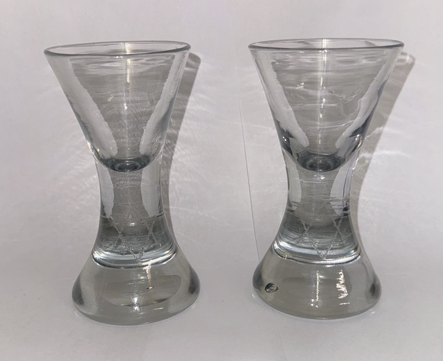 Par timeglasformede frimurer glas. Begge graveret med Davidsstjernen. Ét glas med indgraverer initialer. Begge glas tydeligvis gamle idet der ses flere indikatorer herpå, bl.a. små “lus” i glasmassen, kugleslibning på bunden samt brugsspor. Ingen skader eller reparationer. H. 13 cm