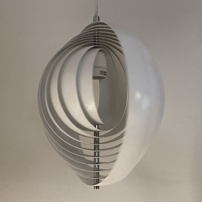 Text zugänglich auf Dänische: Verner Panton Pendel (The Moonlamp) udført af hvidlakeret metal. Formgivet i 1960, fremstillet hos Frandsen Lighting.