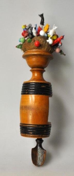 Antike dänische Nähschraube mit Nadelkissen, Dänemark, 19. Jahrhundert. Fassförmig aus Birkenholz mit schwarzen Bändern. Im Nadelkissen befinden sich über 40 verschiedene Nadeln mit Glasfiguren, darunter Elefanten, Hunde, Katzen, Hühner, Enten usw. Höhe mit Nadeln: 30 cm.