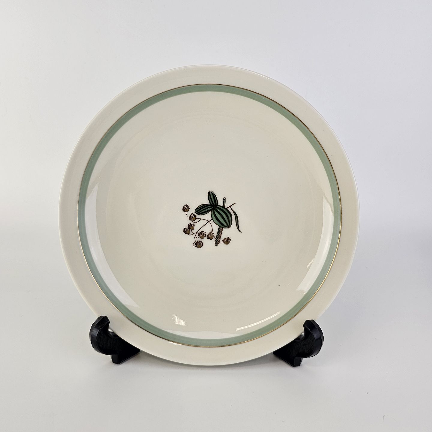 Stel i glat råhvidt porcelæn dekoreret med lysegrøn stribe og guldkant samt motiv af hjertegræs.