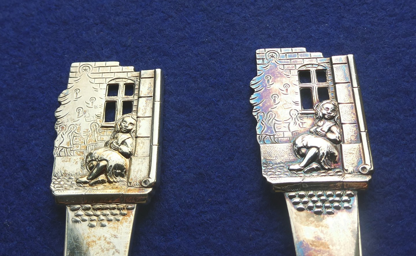 Das kleine Mädchen mit den Schwefelhölzern Kinderbesteck in dänisch vergoldetem Silber. Set Löffel und Gabel