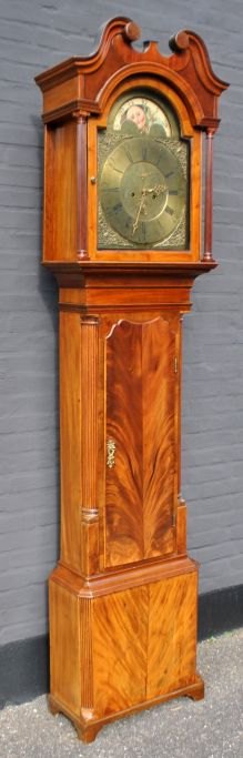 Große englische Standuhr, ca. 1740 - 1750. Samuel Whalley, Manchester. Mahagonigehäuse mit Intarsien. Gehäuse mit Viertelsäulen und Tür. Schwanenhals-Oberteil mit Vollsäulen. Messingwerk. Mit Mondphase. 8-Tage-Werk. Zifferblatt mit Vögeln und Schiff verziert. H.: 232 cm. B.: 50 cm. T.: 24,5 cm.