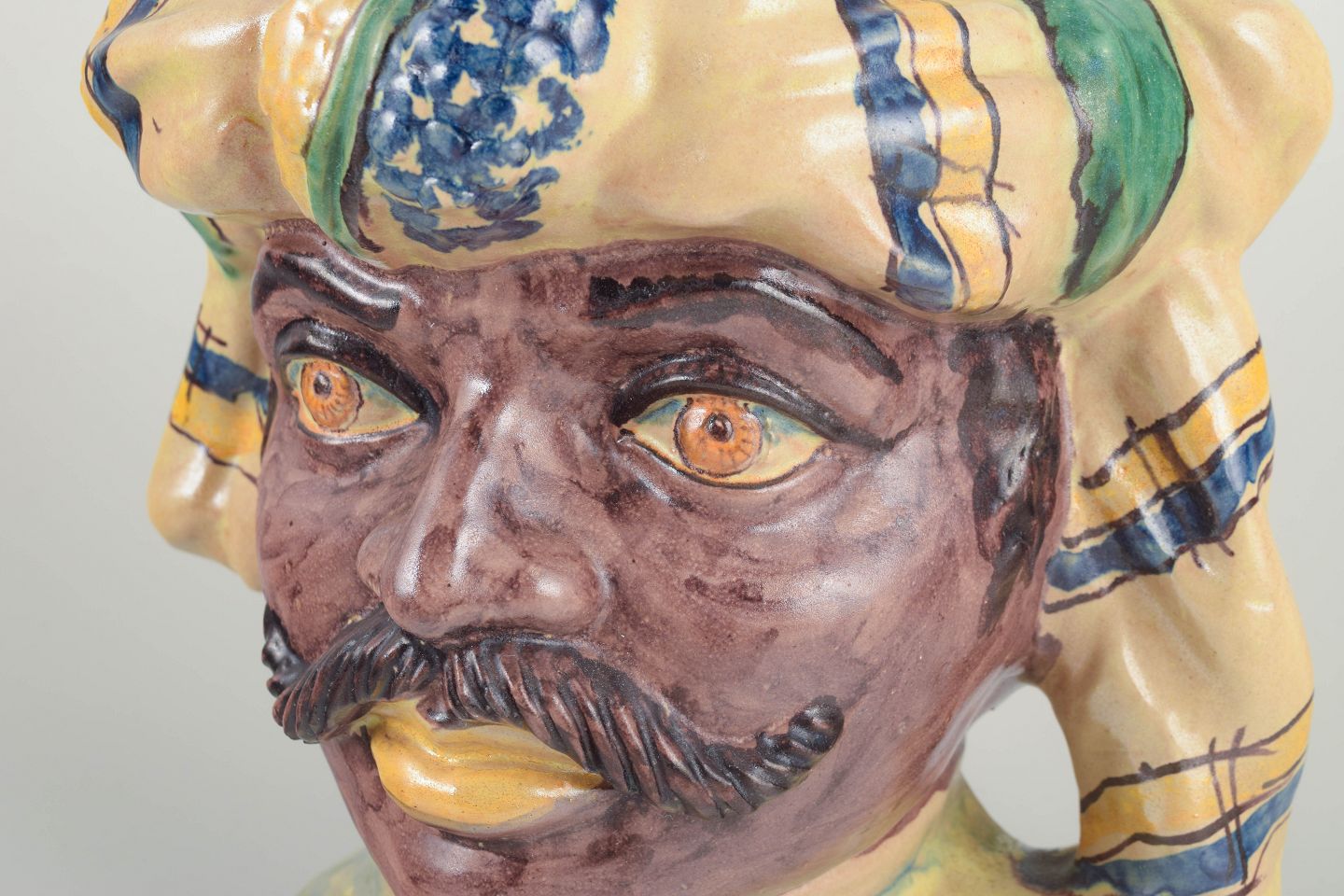 Håndlavet terrakottavase formet som et mandshoved med turban, håndmalet i stærke farver – brun, gul, grøn og blå. Et klassisk eksempel på siciliansk majolikatradition fra Caltagirone.