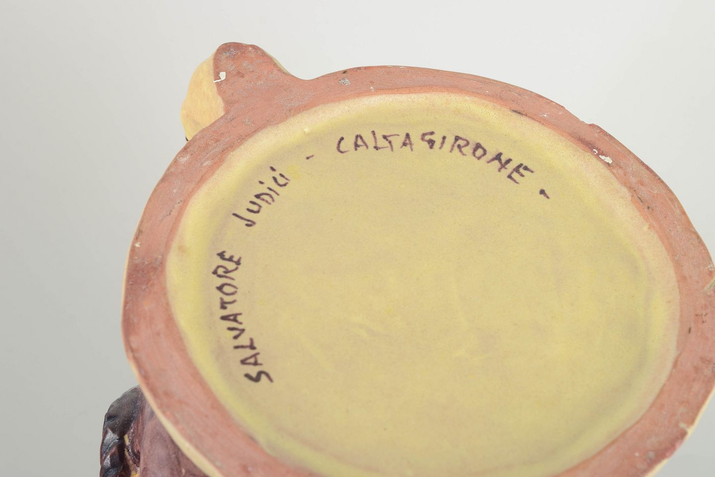 Keramik fra Caltagirone i Sicilien er berømt for sine håndmalede majolikafigurer og farverige motiver, der ofte trækker på lokale traditioner og folklore. Hovedvaser som denne, kaldet Teste di Moro, symboliserer kærlighed og jalousi og er blandt de mest ikoniske former inden for siciliansk keramikkunst.