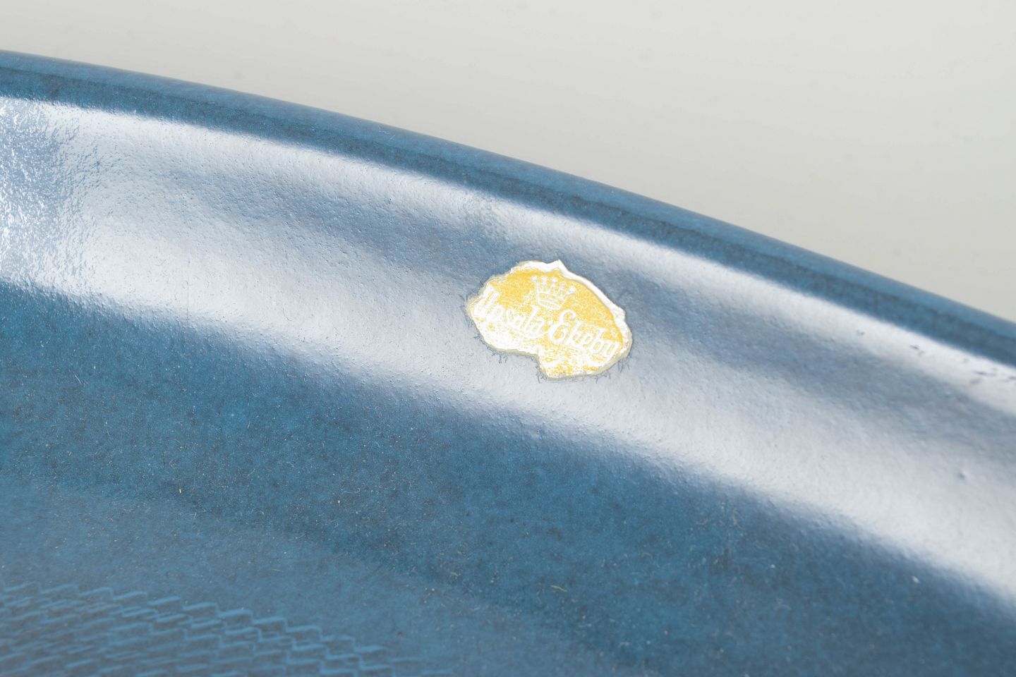 Stort kvadratisk fad i stentøj med afrundede hjørner og smuk blå glasur med spiralformet dekoration i midten. Et klassisk eksempel på Upsala Ekebys 1960’er-design, hvor funktionalitet og æstetik forenes i enkel elegance.