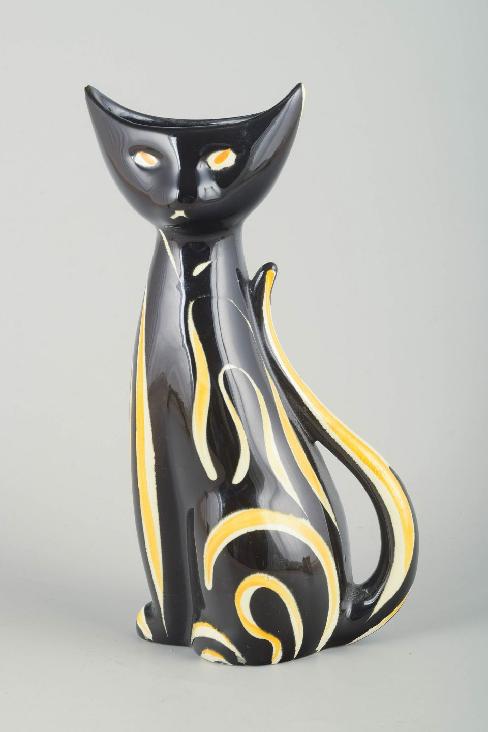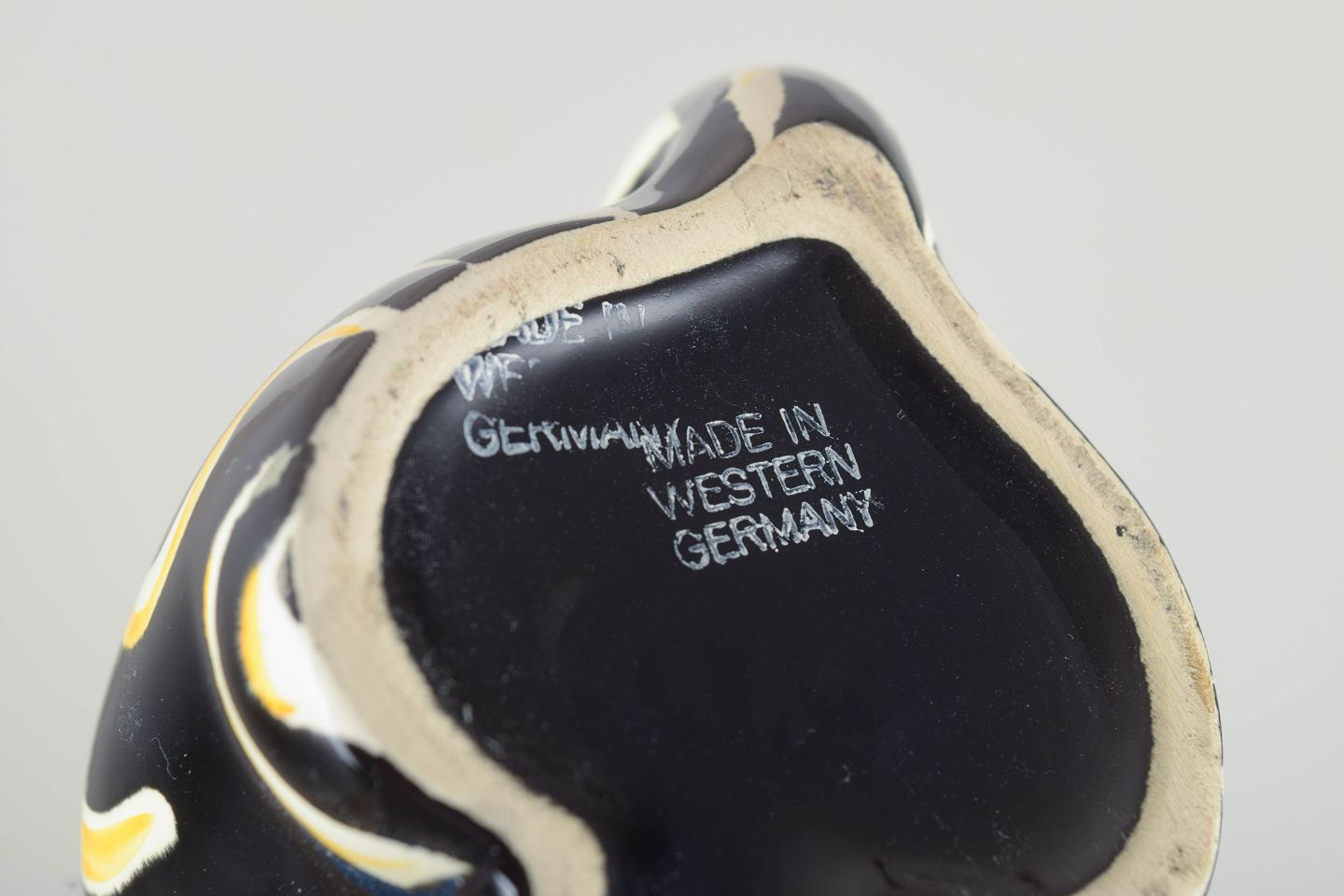 Elegant og stiliseret keramisk vase formet som en kat, i sort glasur med håndmalede gule og hvide linjer i typisk 1970’er-stil. Et dekorativt og humoristisk eksempel på tysk studiokeramik med både skulpturel og funktionel karakter.