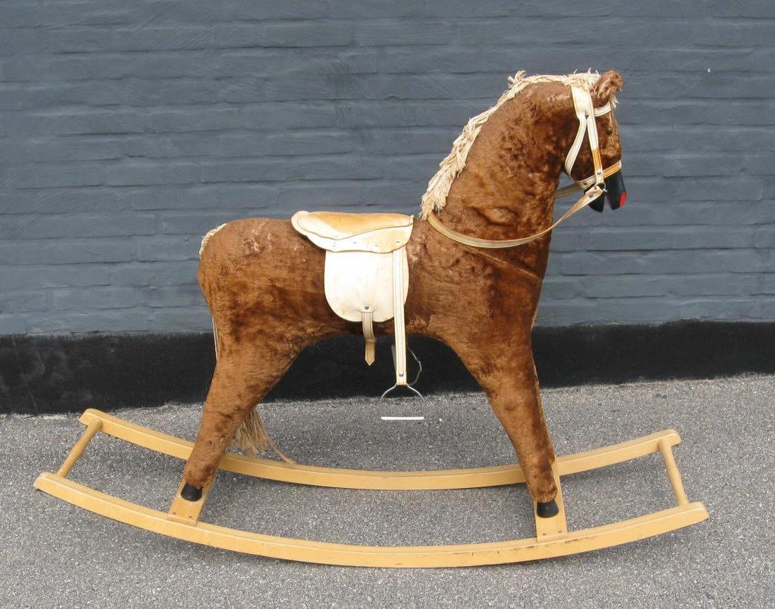 Schaukelpferd aus Holz, gross. Plüschfell, Ledersattel und Riemen. Garn Mähne und Schwanz. 20. Jahrhundert L:.. 150 cm. B:. 38 cm. H:. 105 cm.