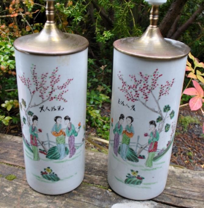 Paar chinesische Hutständer aus Porzellan, 19. Jahrhundert. Umgebaut zu Tischlampen. Handgemalte polychrome Dekorationen einer Frau in einem Garten. Mit chinesischem Text. H.: 29 cm. Höhe mit Elektroinstallation: 53 cm.
