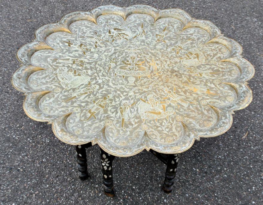 Arabischer Rauchtisch mit Messingplatte aus Indien, 19./20. Jahrhundert. Messingplatte mit Göttern verziert. Holzsockel mit Perlmutt-Intarsien. H.: 47,5 cm. Durchmesser: 77,5 cm.