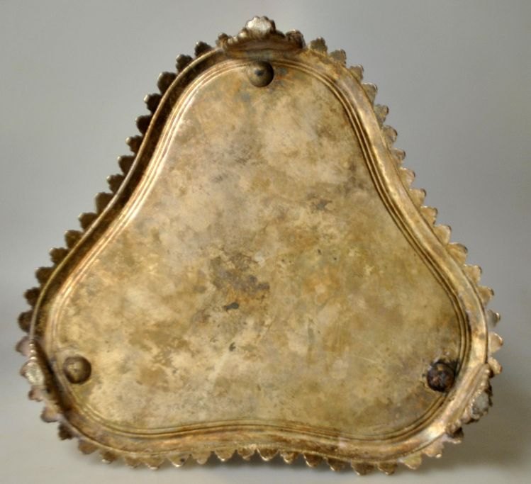 Englischer versilberter Weinhalter, 20. Jahrhundert. Dreieckige Form für drei Flaschen mit Halter. H.: 26 cm. B.: 25 cm.