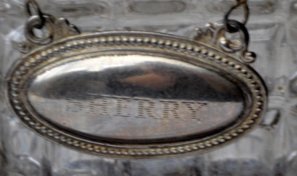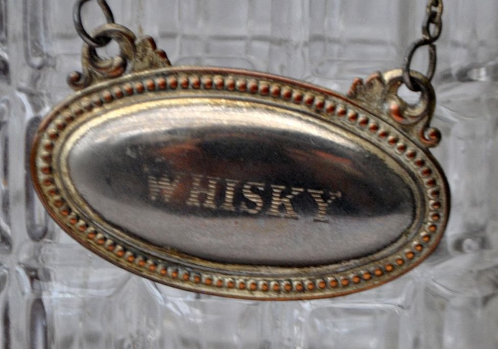 Englischer Tantalus mit drei Kristallkaraffen, 19. Jahrhundert. Polierte Eiche. Mit Messingbeschlägen und Schloss mit Schlüssel. Die Karaffen sind mit versilberten Schildern für Brandy, Sherry und Whisky versehen. Höhe: 31 cm. Länge: 35 cm.