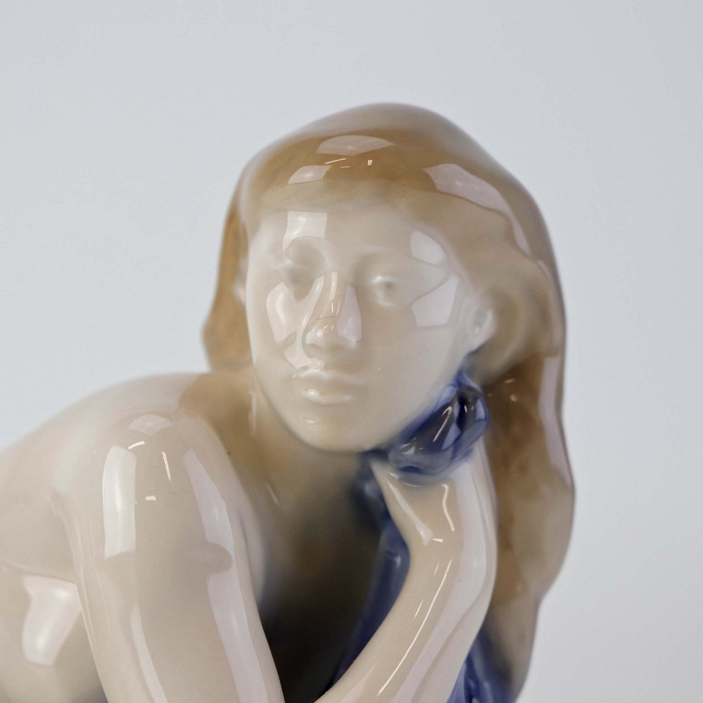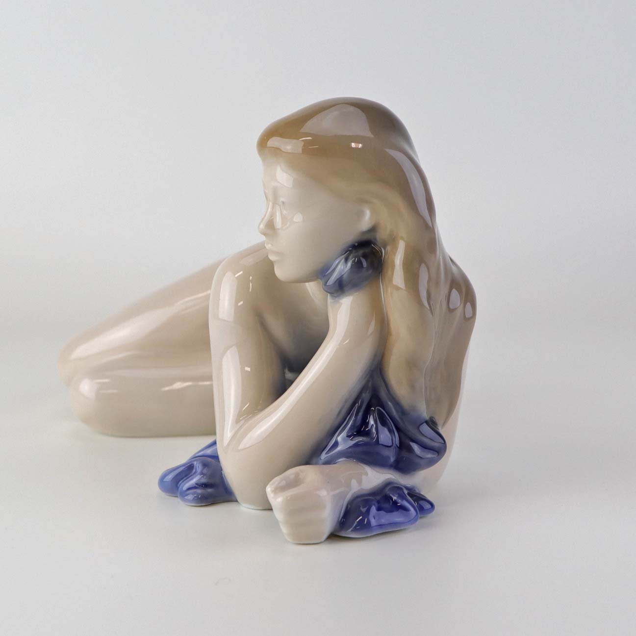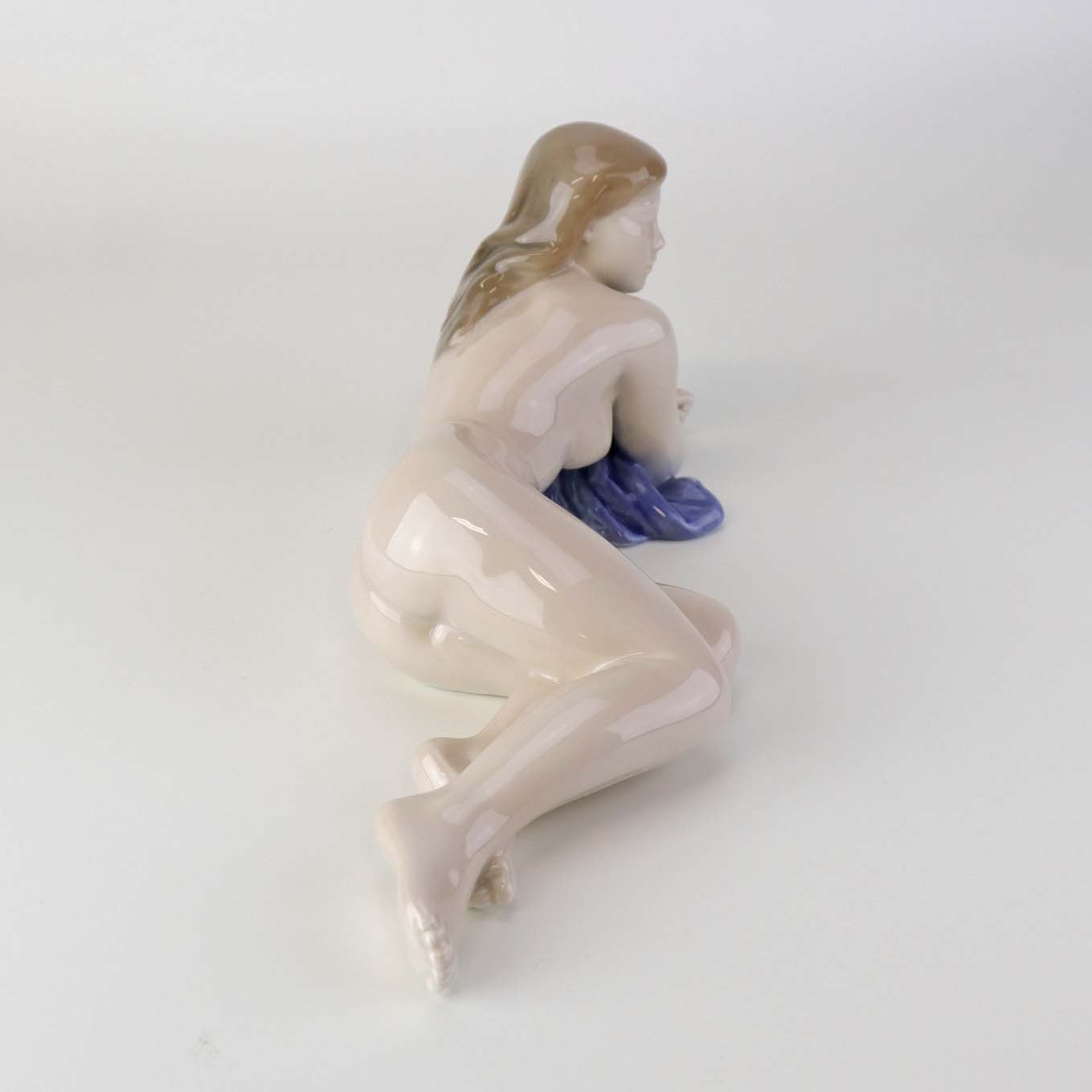 Figur i porcelæn med motiv af liggende nøgen kvinde med blåt klæde. Nr. 4703