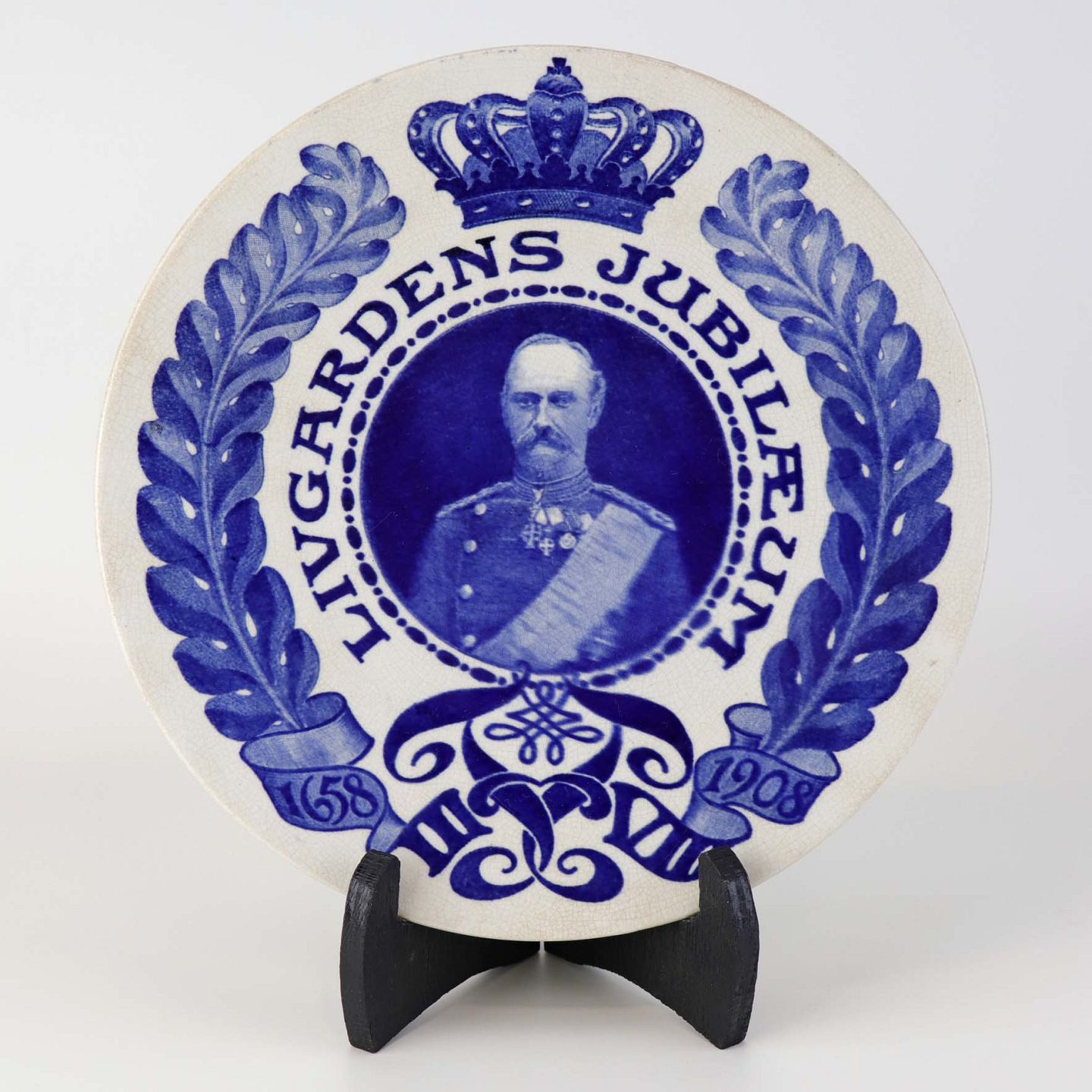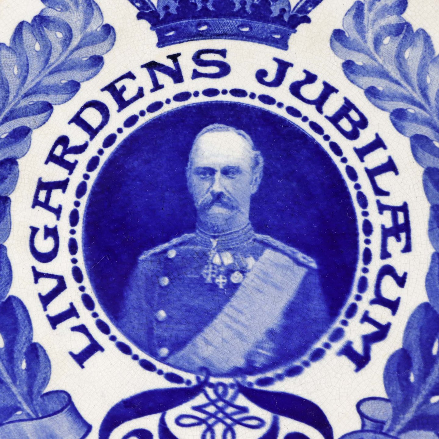 Text zugänglich auf Dänische: Platte i fajance, som blev udgivet i forbindelse med Livgardens 250 års jubilæum med teksten Livgardens jubilæum år 1658-1908 og motiv af Kong Frederik VIII