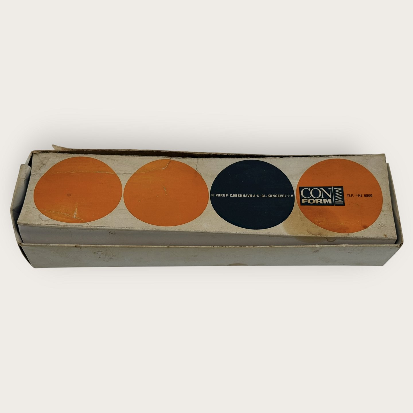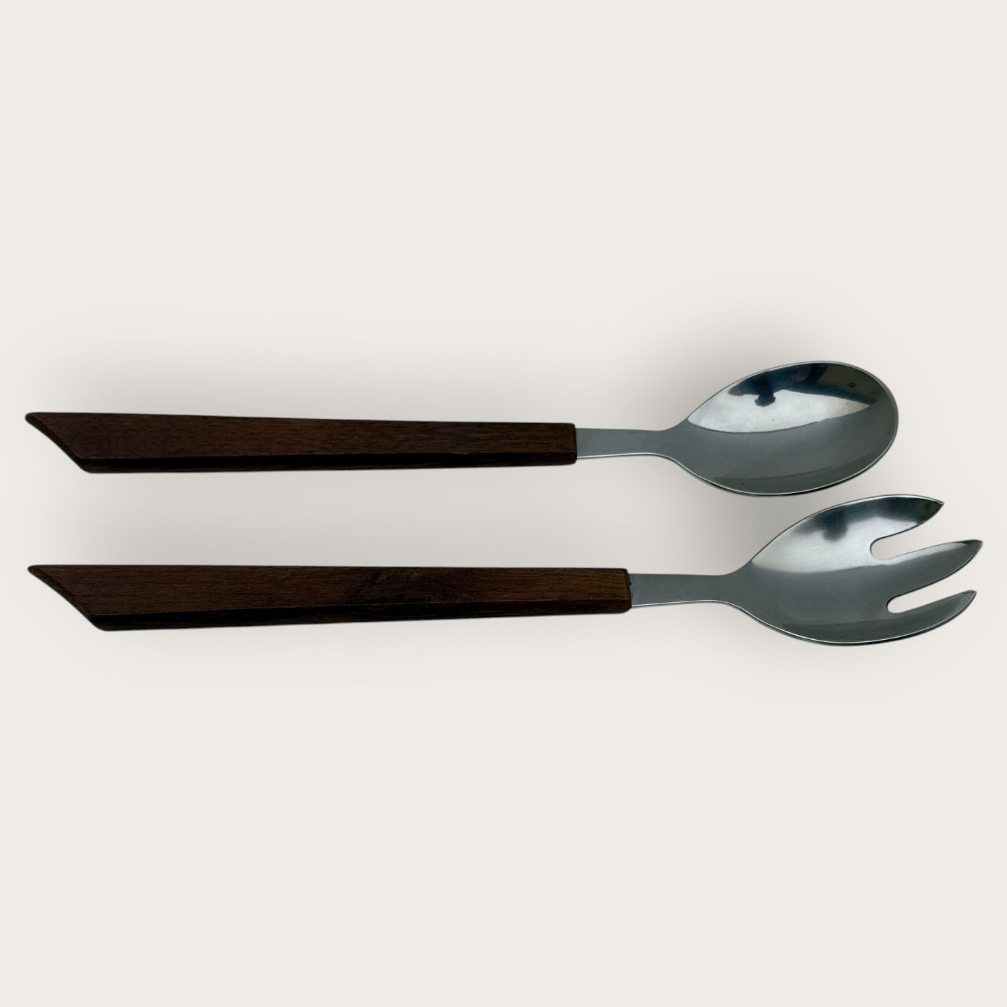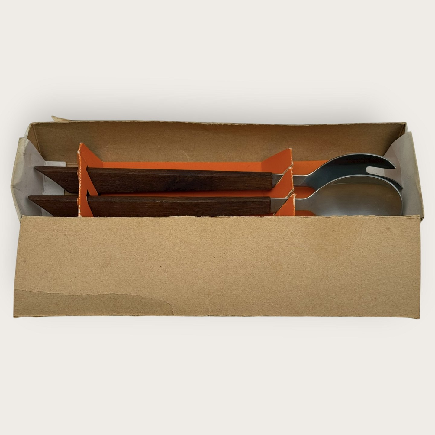 Con Form Salatservice aus Teakholz und Stahl aus den 1960er Jahren, im Originalkarton, 26,5 cm lang *Karton etwas abgenutzt, ansonsten in gutem Zustand*