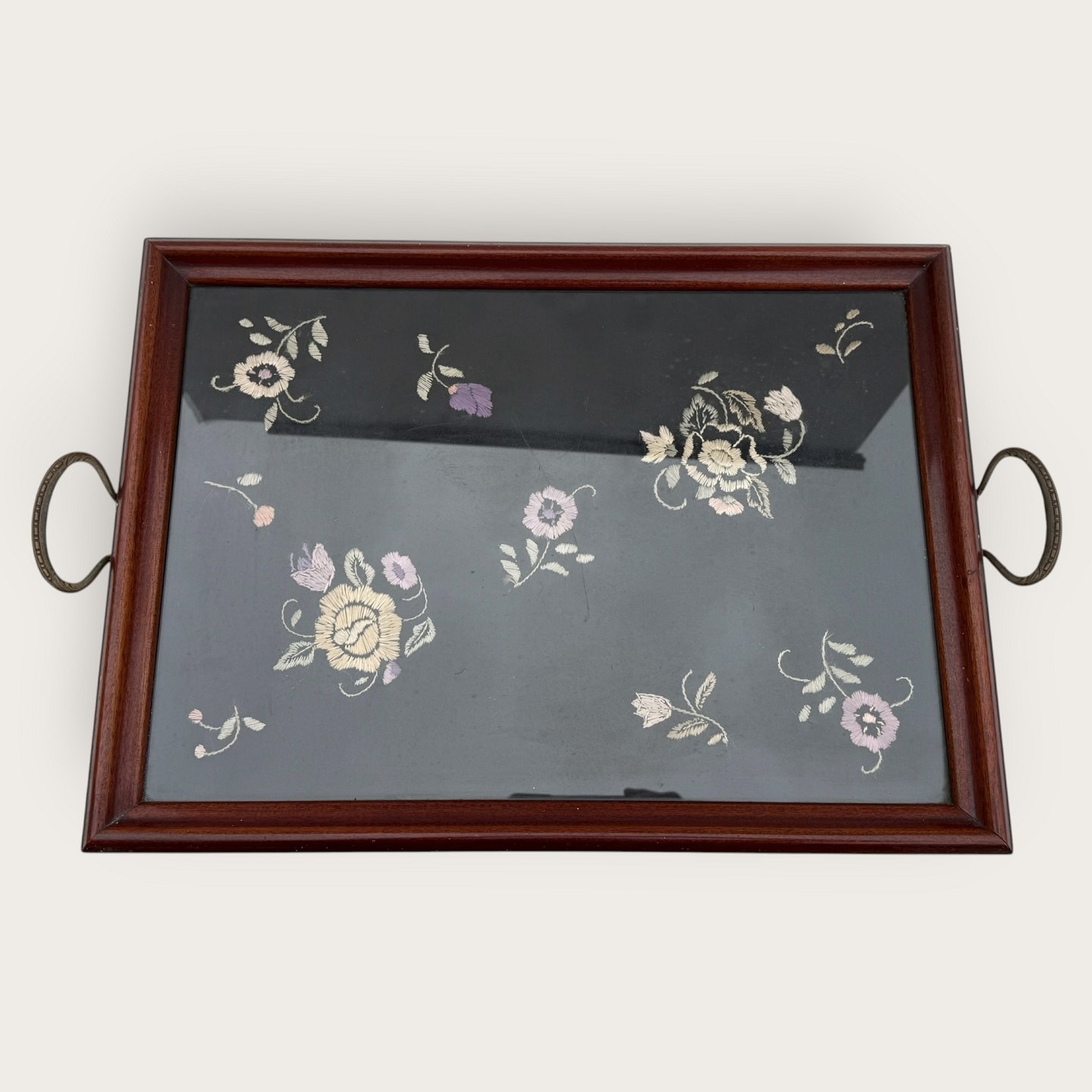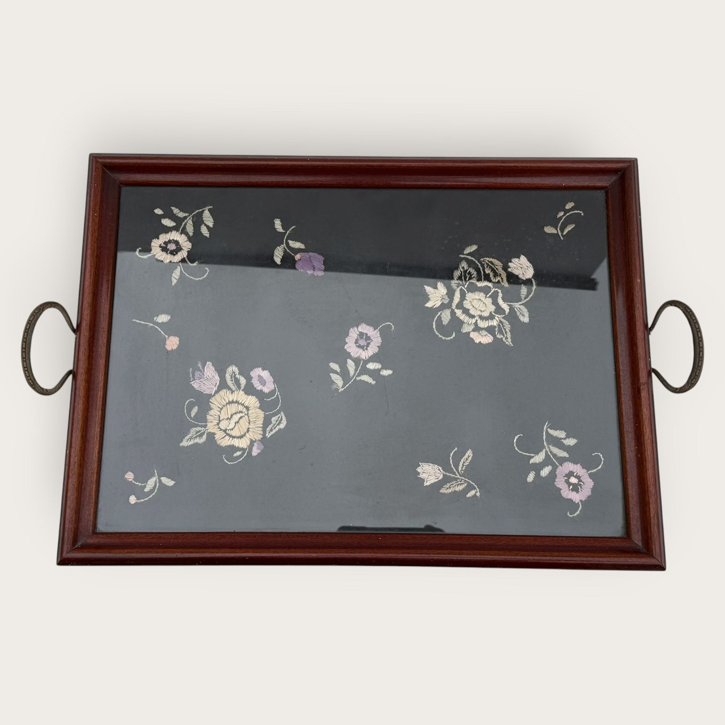 Tablett mit Metallgriff und Stickerei unter der Glasplatte, 35 x 47 cm (ohne Griff) *guter Zustand*