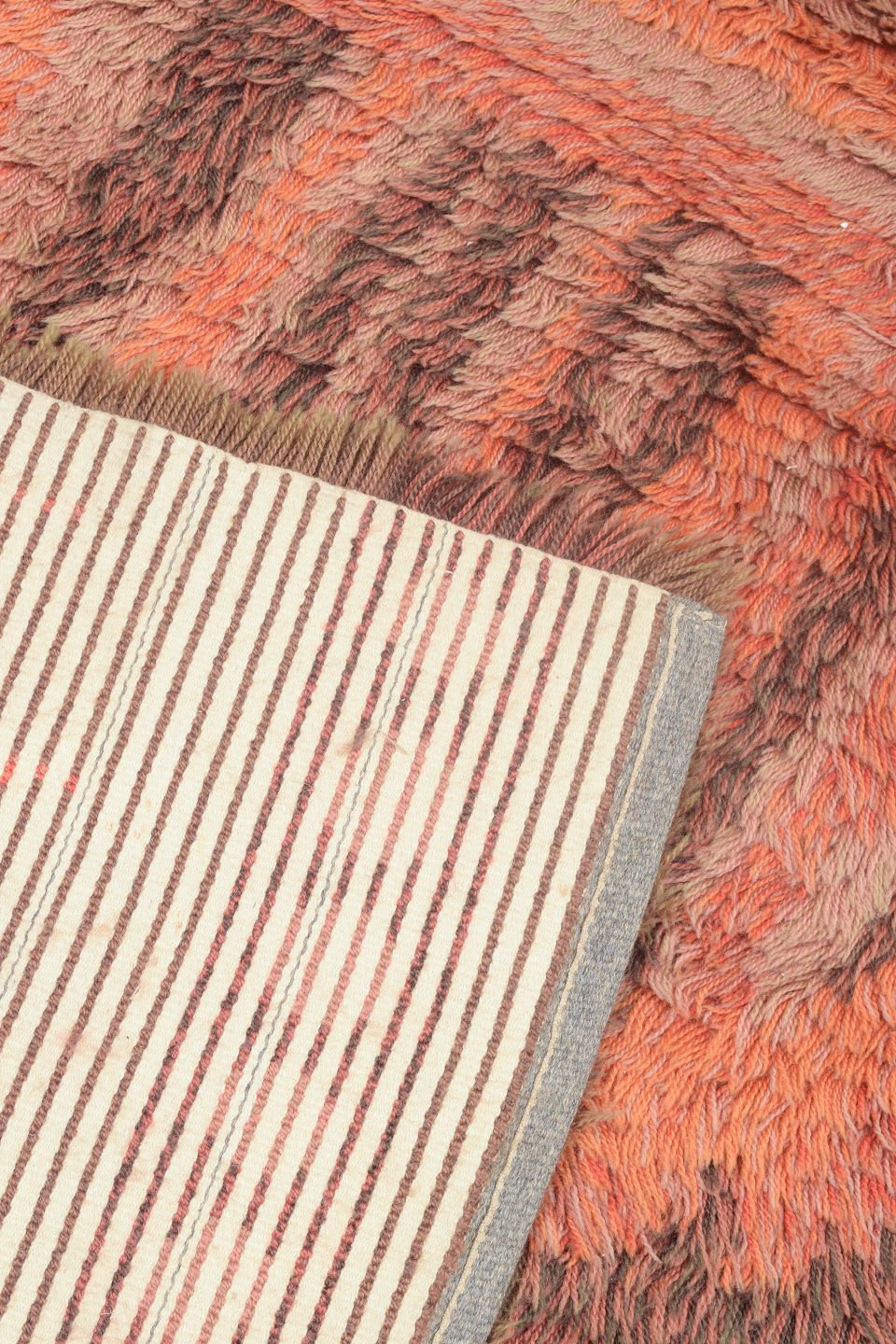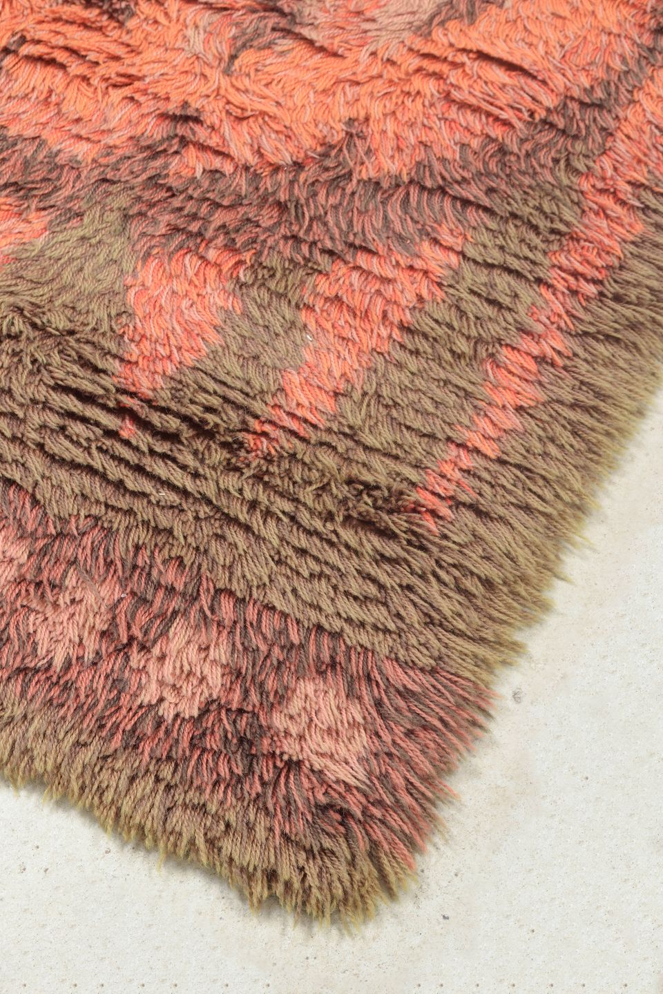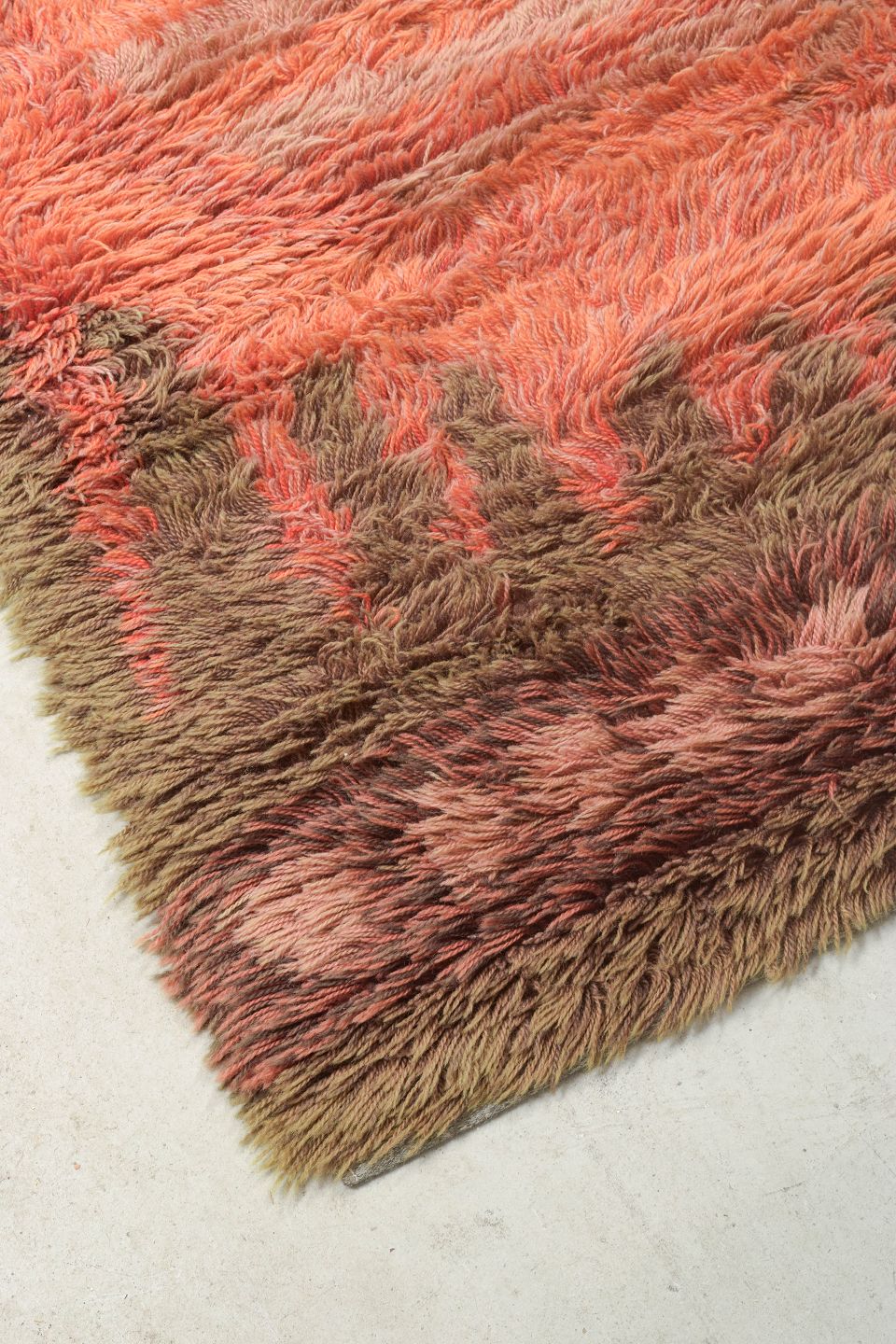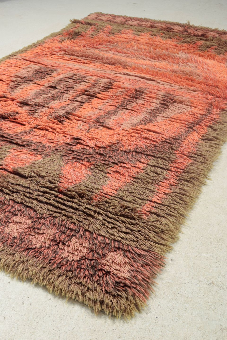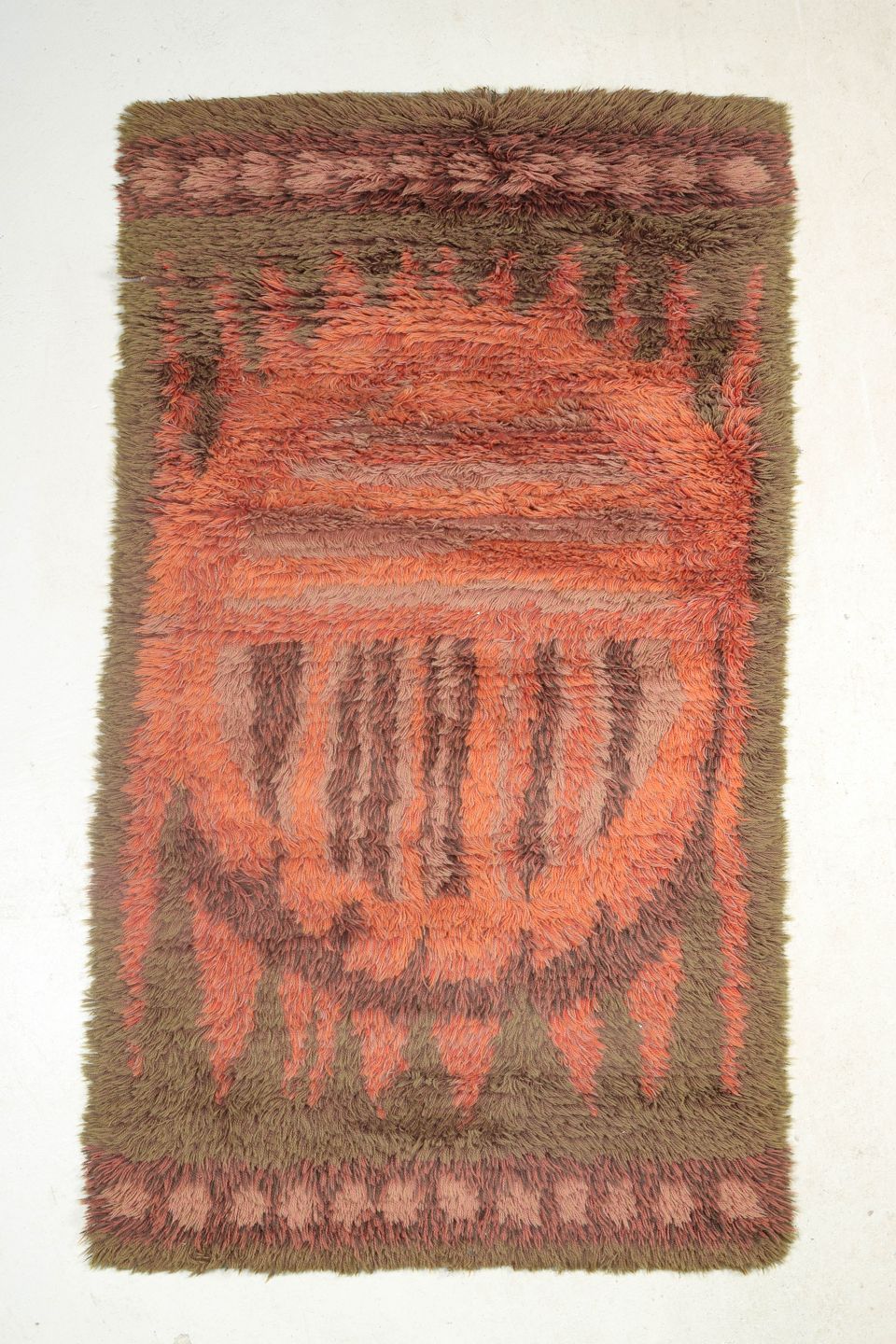 Håndknyttet rya-tæppe i uld med solinspireret motiv i varme orange, brune og olivengrønne nuancer. Et markant og stemningsfuldt design, der afspejler periodens interesse for natur, farvesymbolik og organiske former i skandinavisk tekstilkunst.