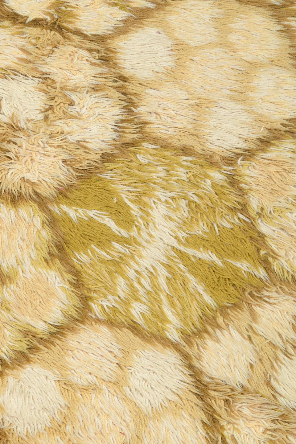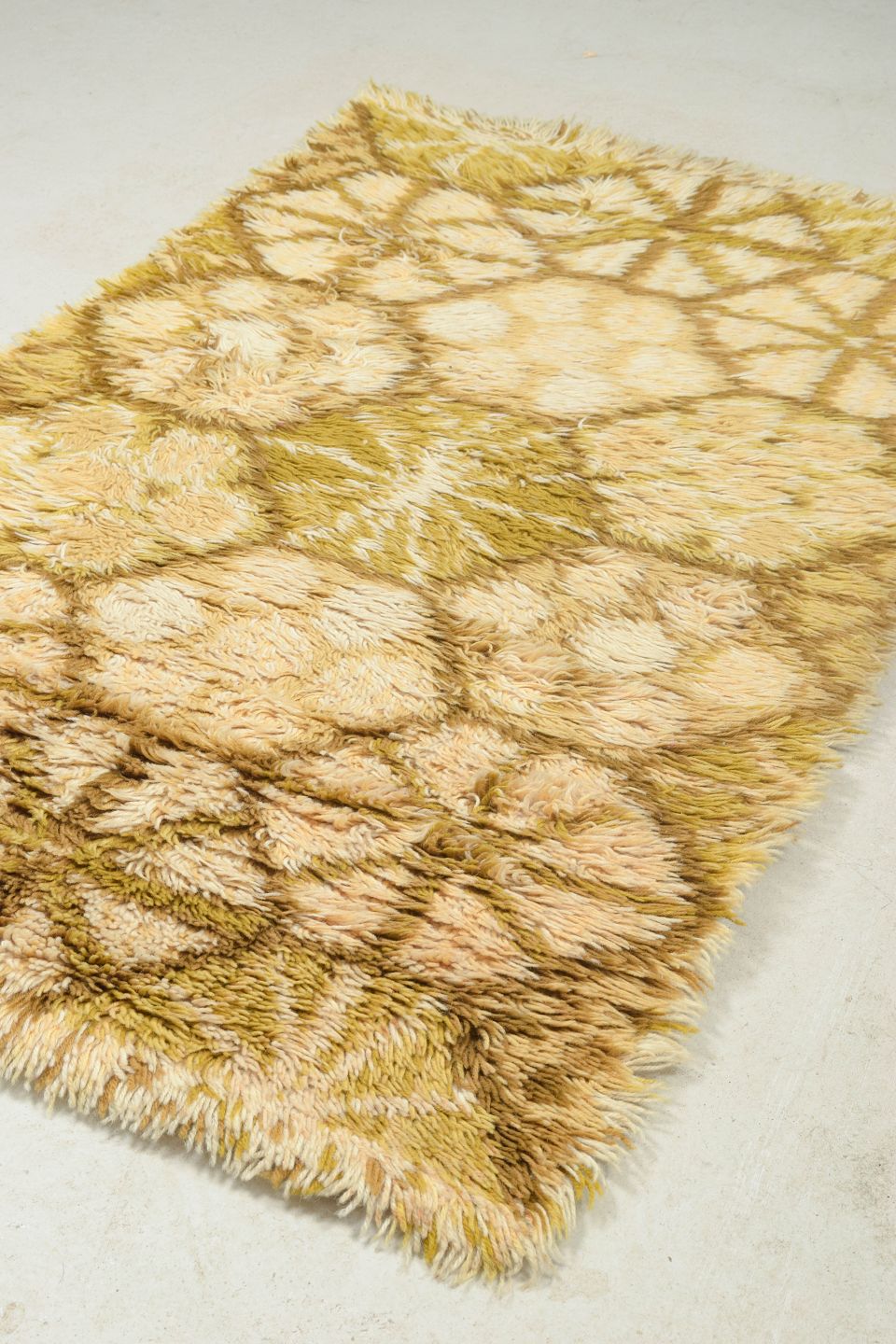Håndknyttet rya-tæppe i uld designet af Marianne Richter, med geometrisk mønster i gyldne, beige og olivengrønne toner. Et raffineret eksempel på svensk tekstilkunst, hvor modernistiske former kombineres med varme, naturlige farver.
