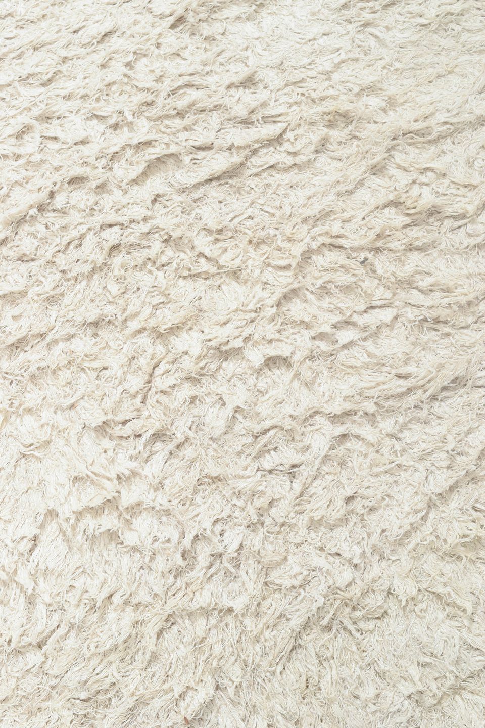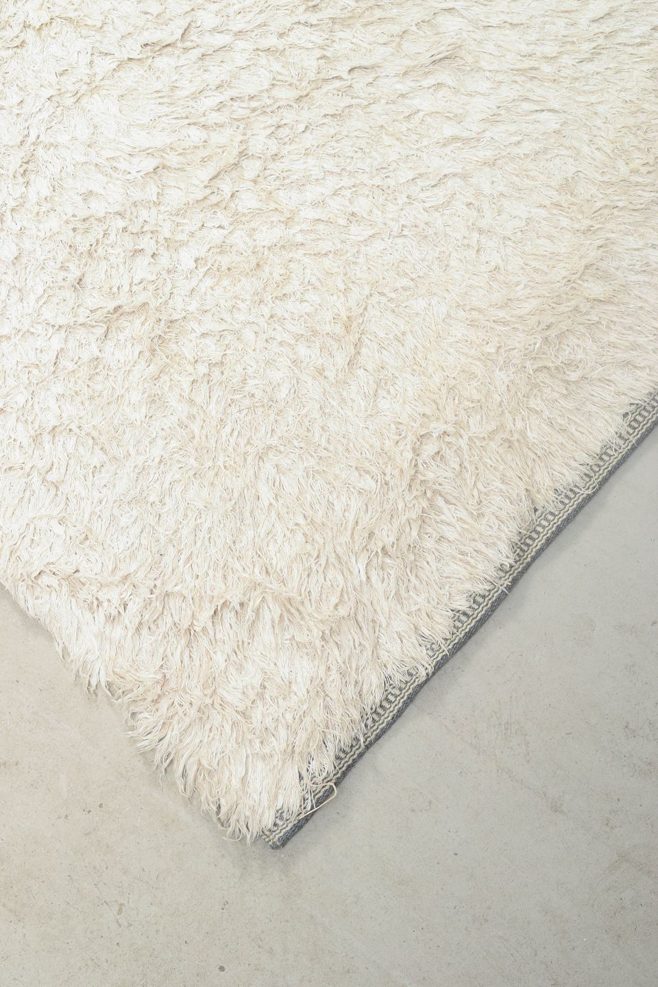 Håndknyttet rya-tæppe i naturhvid uld med tæt, blød luv. Et minimalistisk og elegant design, typisk for skandinavisk indretning i perioden, hvor materialets struktur og taktilitet blev sat i fokus frem for mønster.