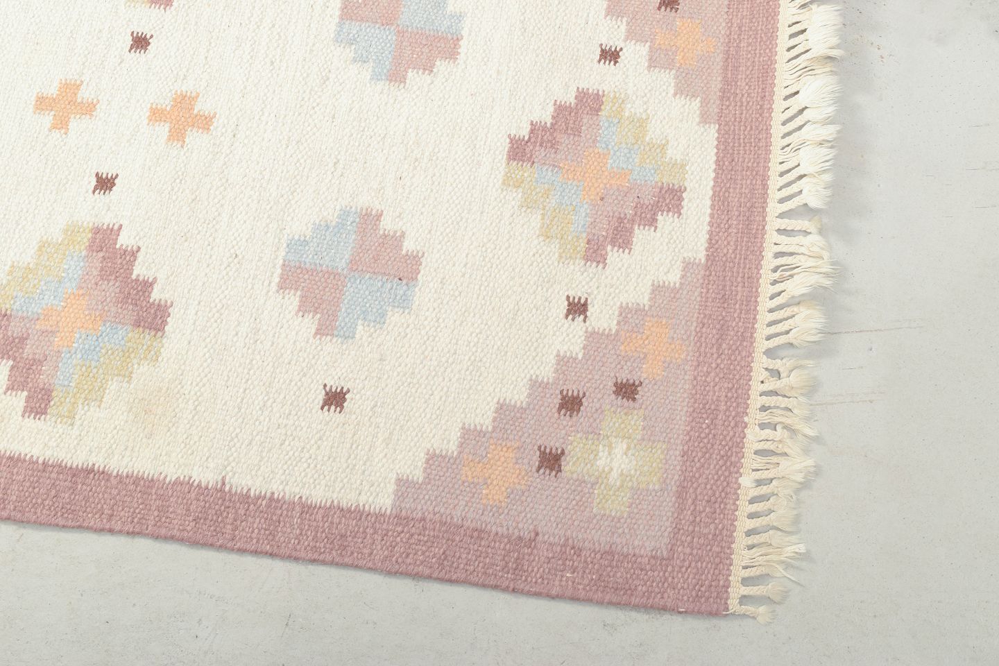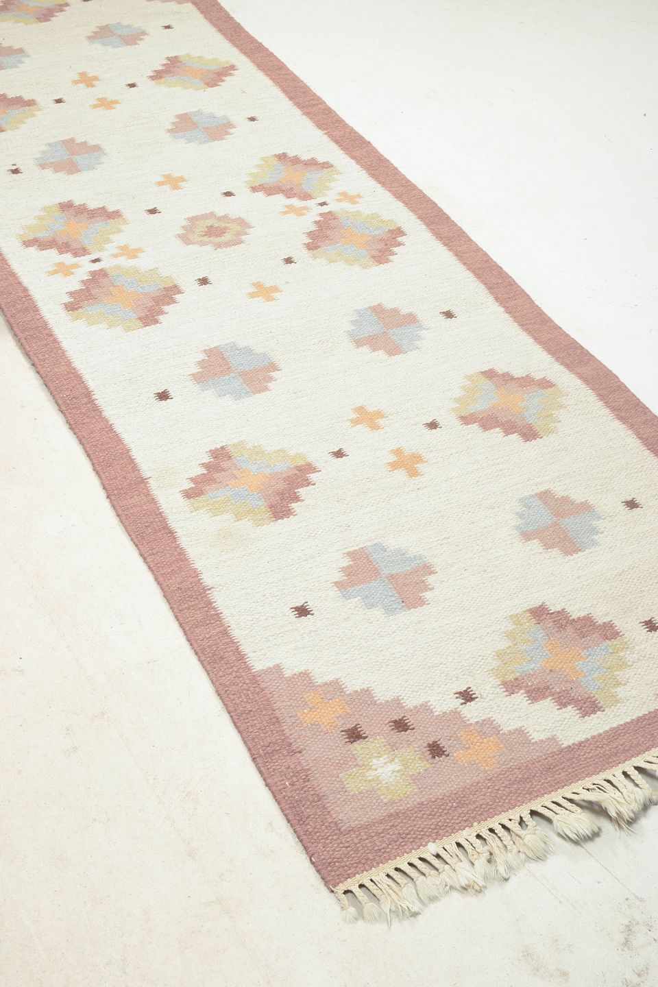 Håndvævet rölakan-løber i uld med symmetrisk, geometrisk mønster i lyse pasteltoner af rosa, blå, gul og beige. Et fint eksempel på svensk håndværkstradition med fokus på farveharmoni og enkel formgivning.