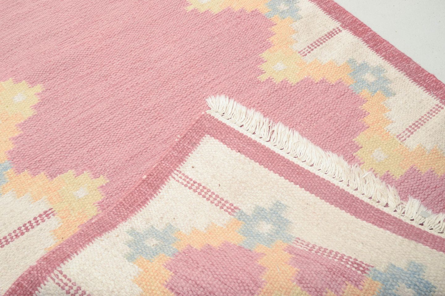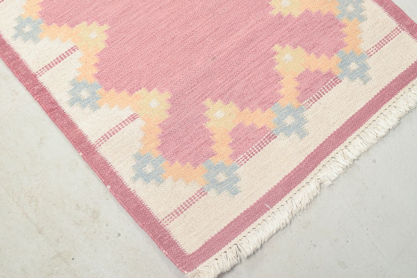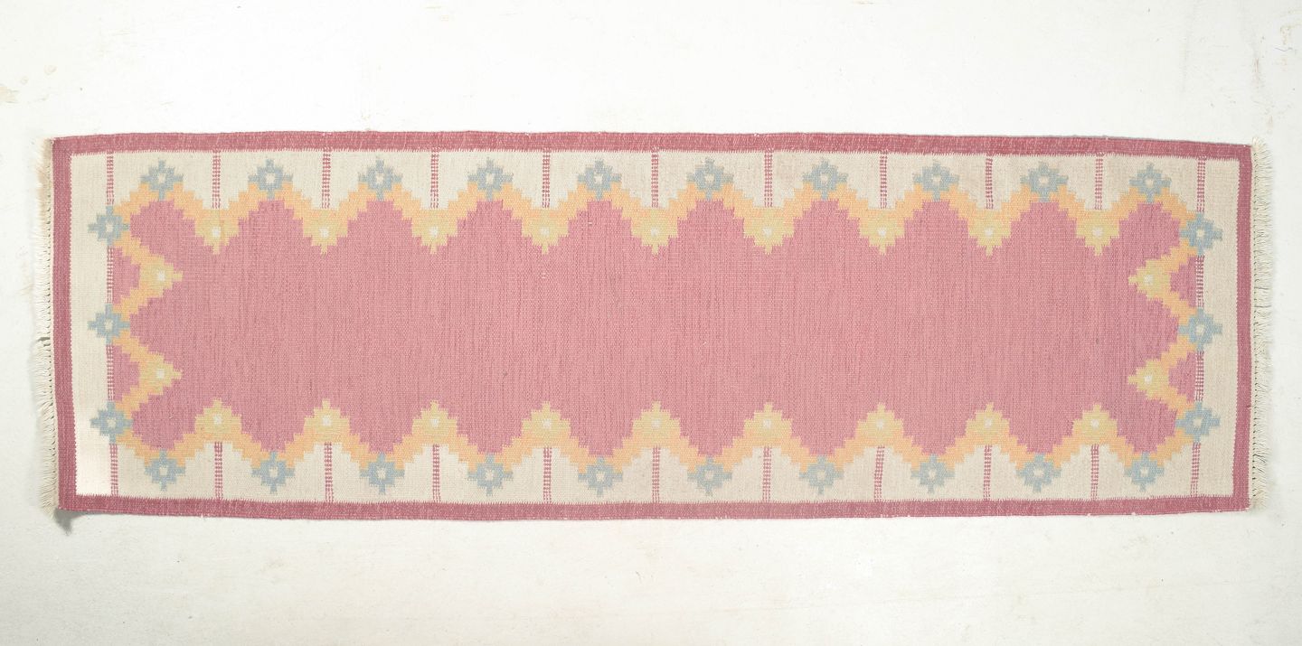 Håndvævet rölakan-løber i uld med geometrisk mønster i rosa, gule og lyseblå toner. Et dekorativt eksempel på svensk tekstilkunst fra 1960’erne, der kombinerer farverig enkelhed med klassisk fladvævning.