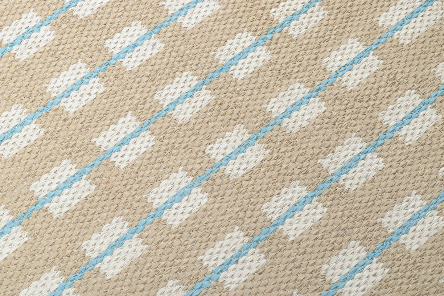 Rektangulær bordløber i vævet plast med grafisk mønster i beige og lyseblå nuancer, typisk for 1970’ernes funktionelle og farveglade interiørdesign.