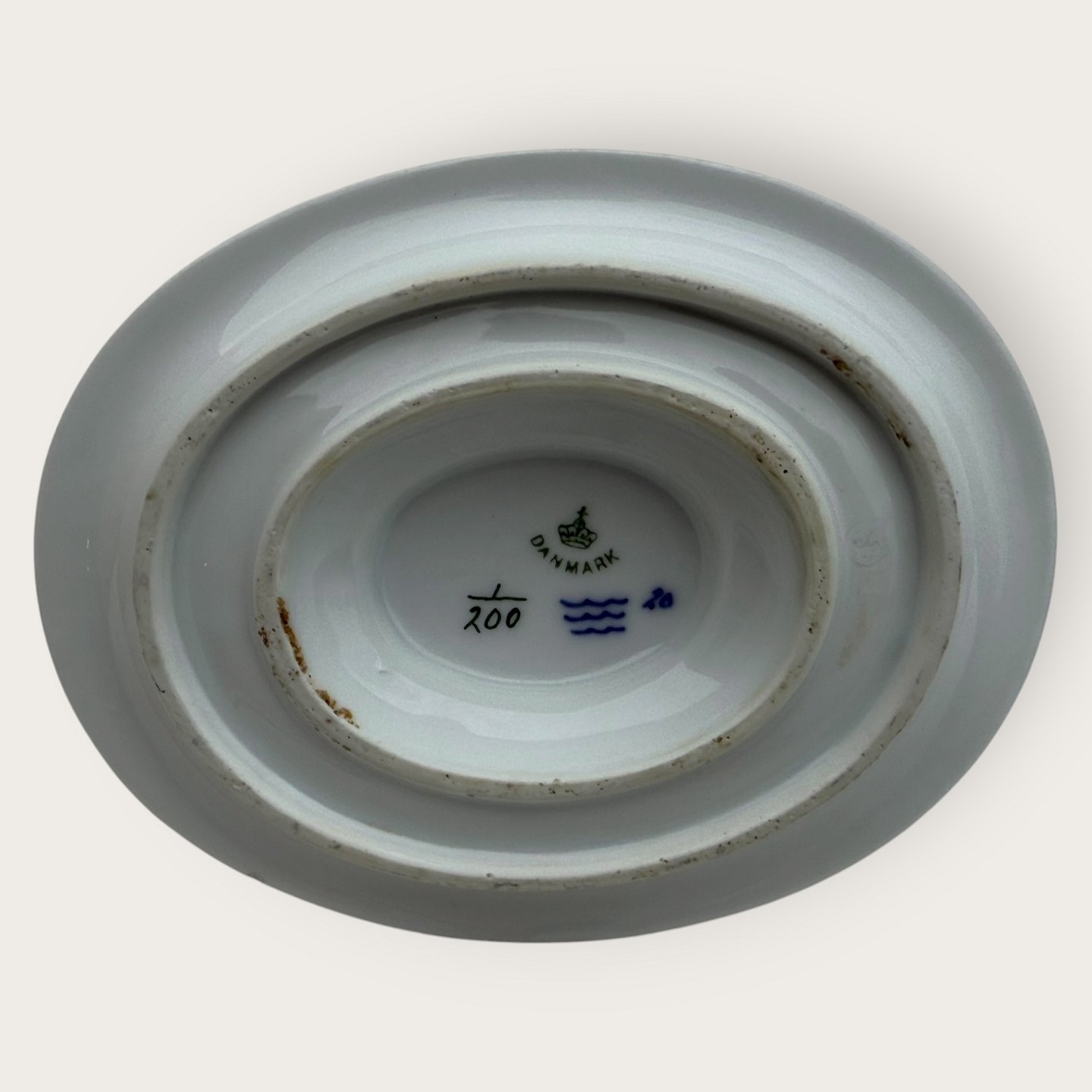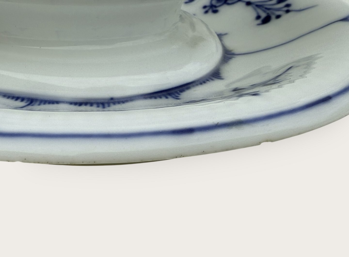 | Royal Copenhagen, blau geriffelte Saucenkanne auf festem Fuß, Nr. 1/200, Maße ca. H x B x T 10 x 20 x 13 cm, hergestellt zwischen 1894 und 1900. * Mit 2 sehr kleinen Absplitterungen unterhalb des Fußrandes (siehe die letzten 2 Fotos), ansonsten in gutem, gebrauchtem Zustand.