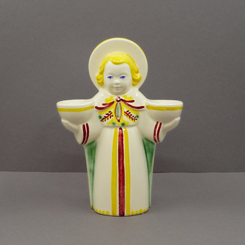 Aluminia; Juleengel i fajance. Med plads til to lys. H. 13,5 cm.