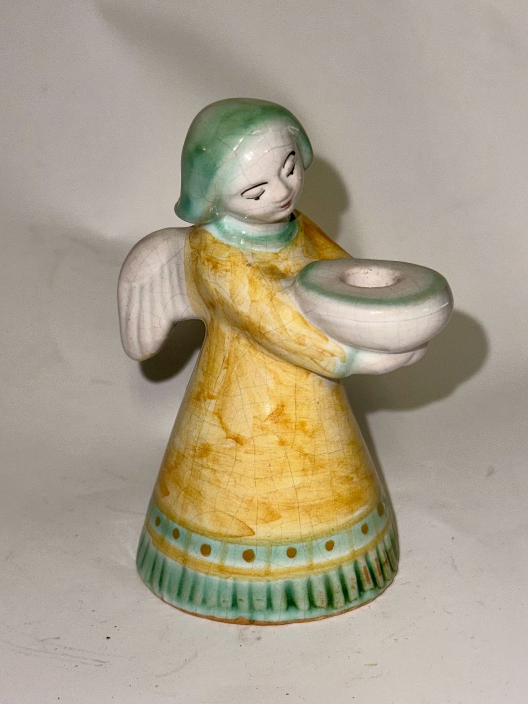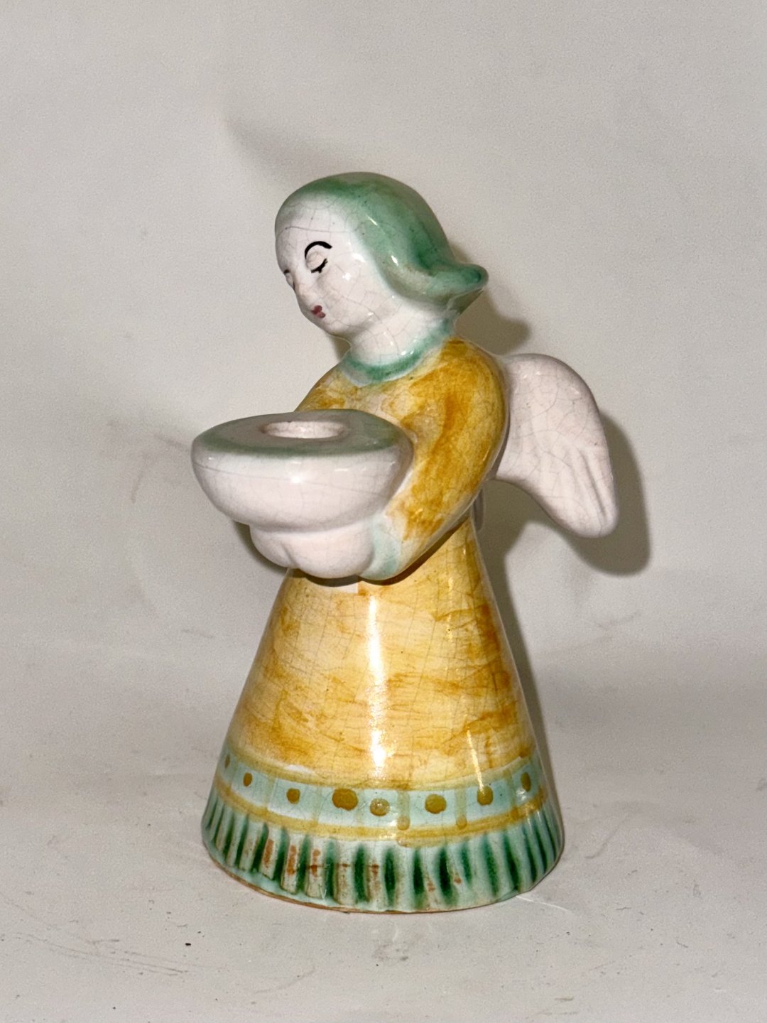 ENGEL I GUL KJOLE: Figur af bemalet engel i keramik som lyseholder fra den bornholmske lervarefabrik Lauritz Hjorth. Englen er iført gul kjole. Fremstår i god stand. Fabriksmærket på bunden. H. 10 cm