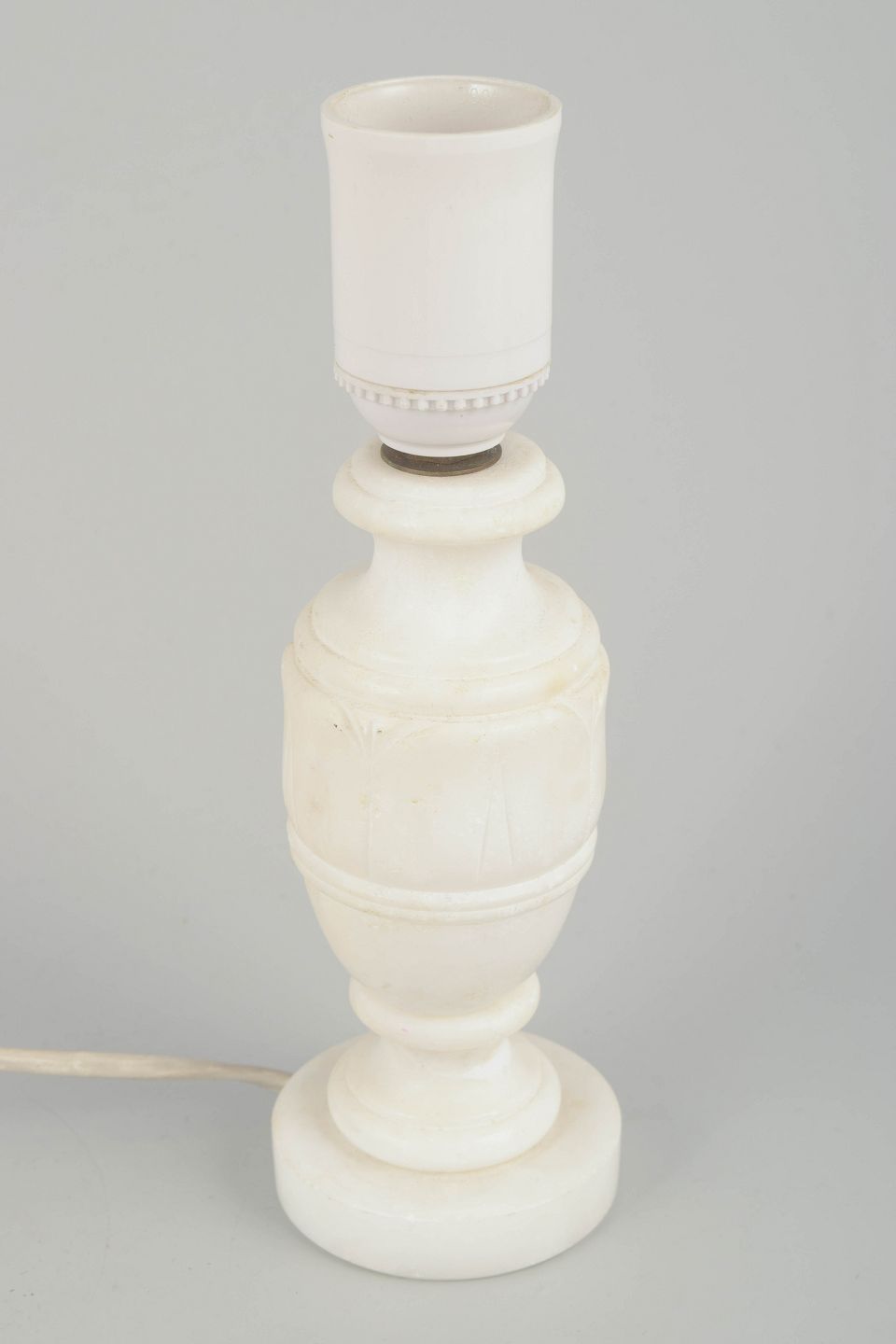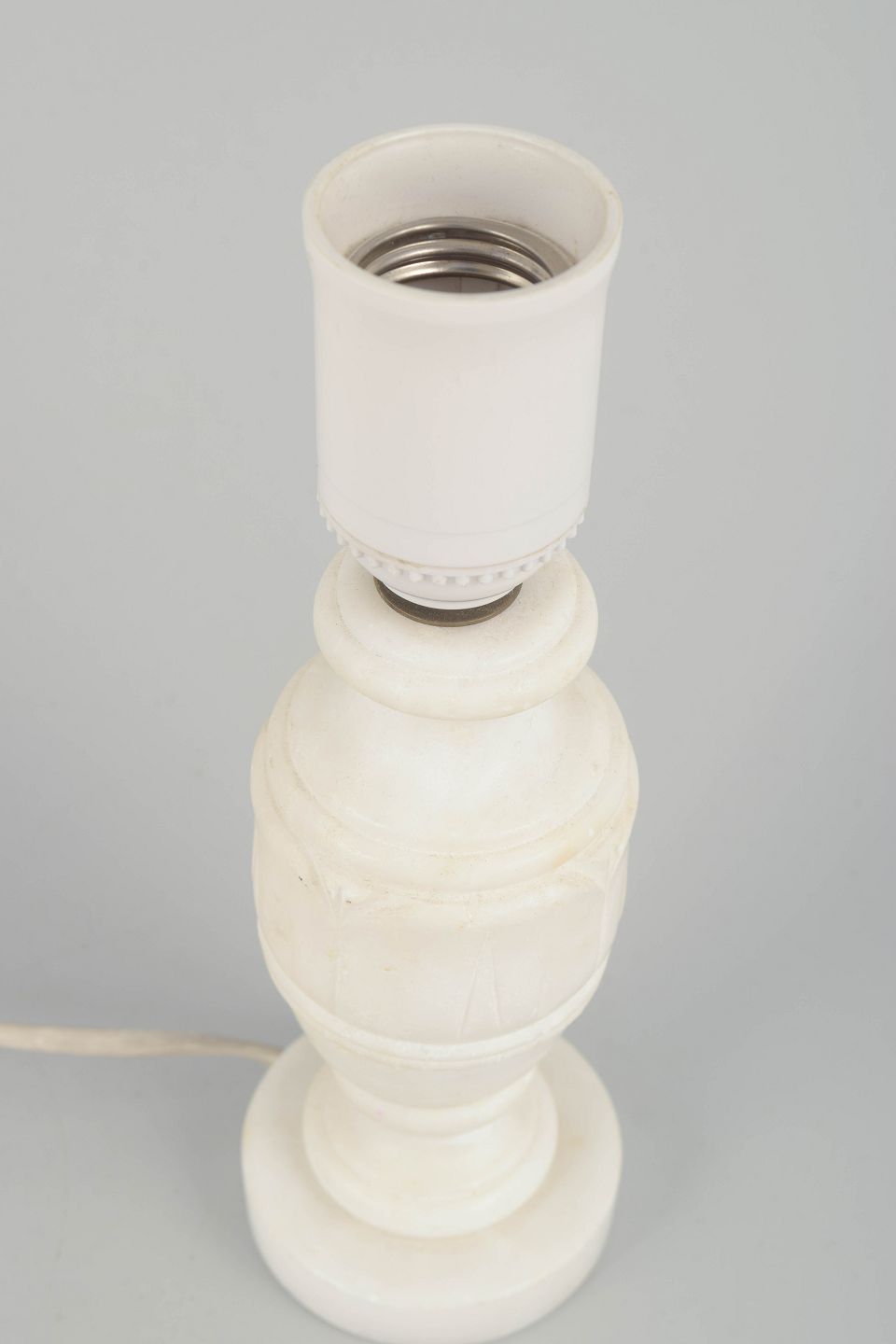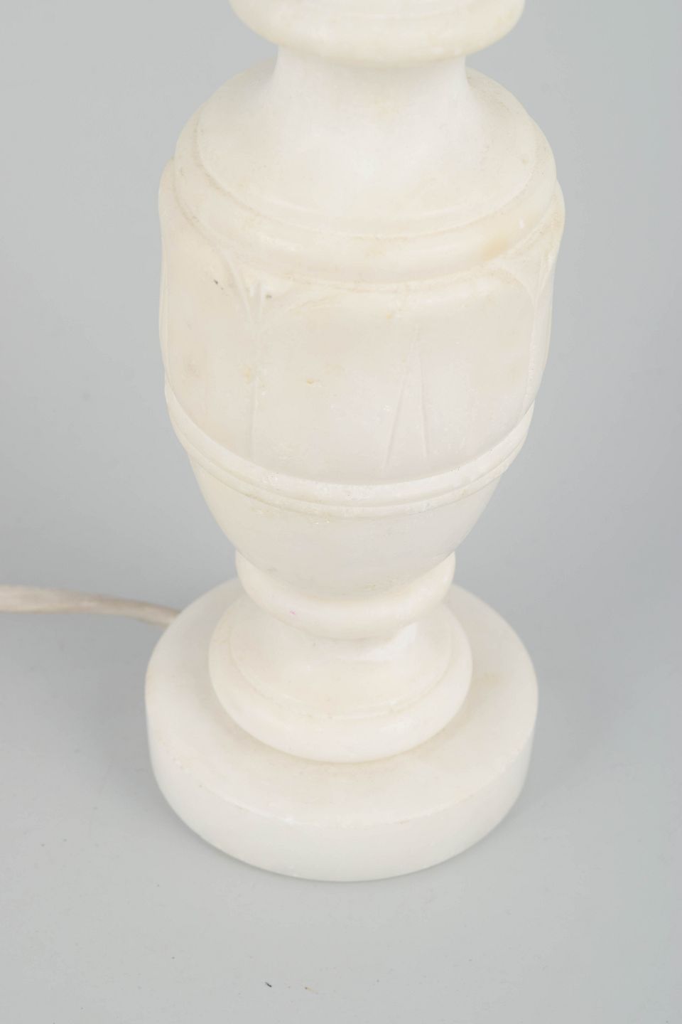Klassisk formet bordlampe udført i alabast med elegant balusterformet fod og naturlig hvid stenstruktur. Et tidstypisk eksempel på italiensk håndværk fra perioden, der kombinerer enkelhed og klassisk proportion.