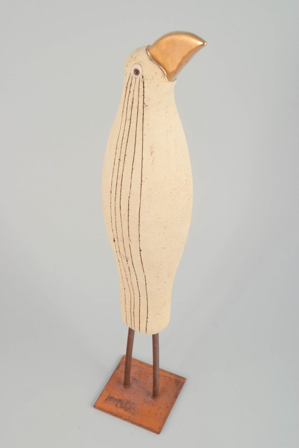 Elegant fugleformet skulptur i håndformet stentøj med lys, let ru overflade og indgraverede linjer, monteret på metalben med base i jern. Næbbet i metallisk glasur skaber en markant kontrast til den matte krop. Signeret af kunstneren.