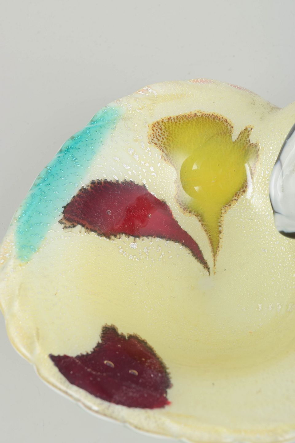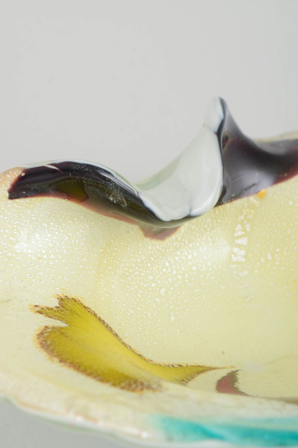Dekorativ kunstglas skål i håndblæst glas med asymmetrisk form og flerfarvet glasur i gule, røde, turkise og mørke toner. Skålen har en udtalt plastisk form med bølgende kant og indre tekstur, typisk for Murano-glasværkernes eksperimenterende periode i midten af det 20. århundrede.