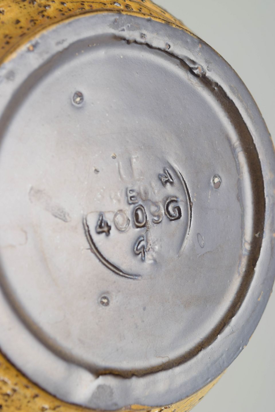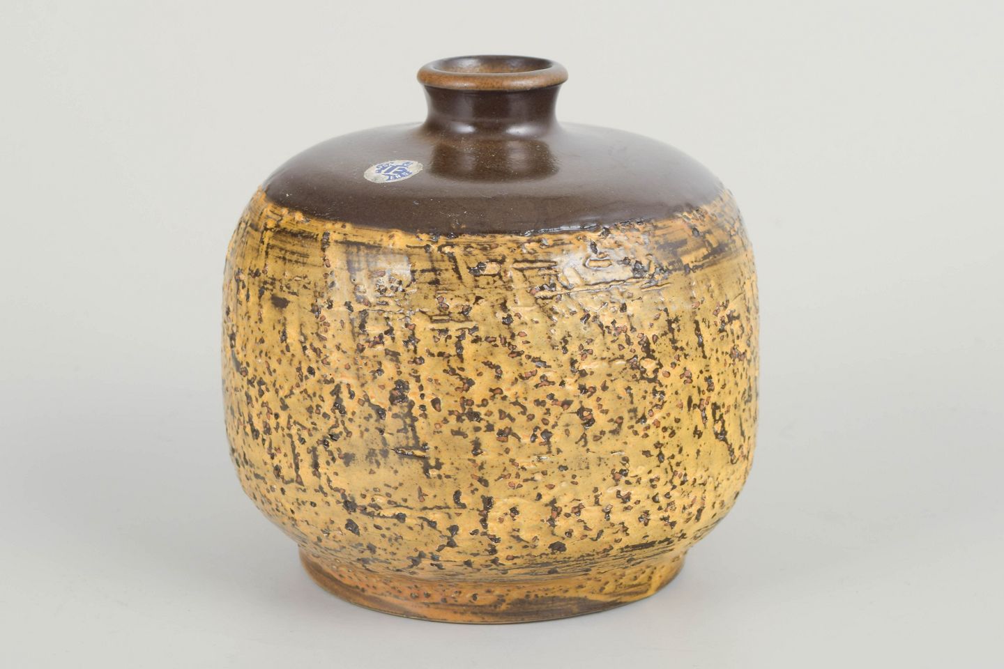 Hånddrejet stentøjsvase med cylindrisk korpus og lille hals, dekoreret med en levende gulbrun glasur med mørke teksturelle spor, der giver overfladen en markant, rustik karakter. Et klassisk eksempel på Anderssons håndværk og den eksperimenterende glasuræstetik hos Upsala Ekeby i 1960’erne.