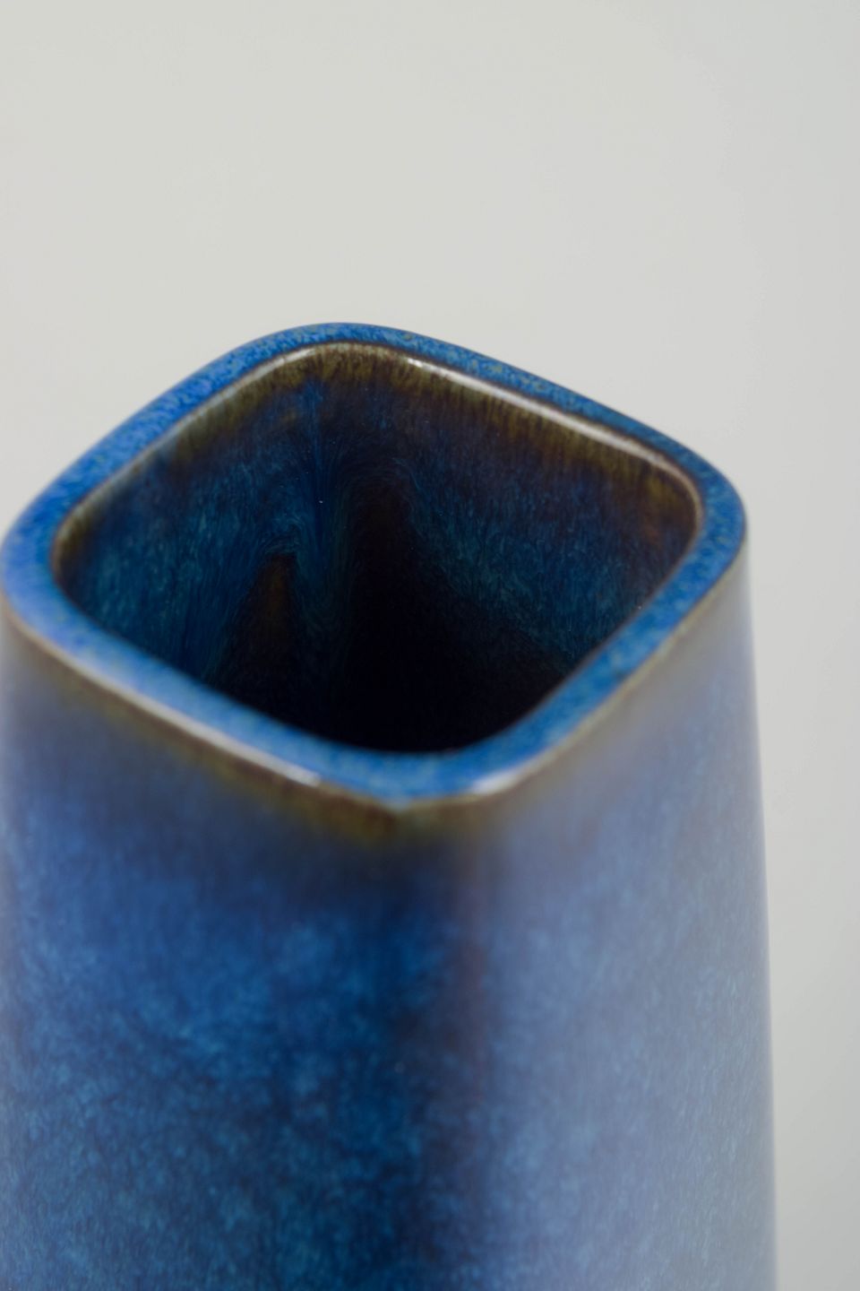 Rektangulær vase i stentøj med håndpåført blå laguneglasur i levende nuancer af azur, kobolt og gråtoner. Et klassisk eksempel på Gustavsbergs forfinede glasurarbejde fra perioden, hvor modernistiske former blev kombineret med dyb, sanselig farvevirkning.