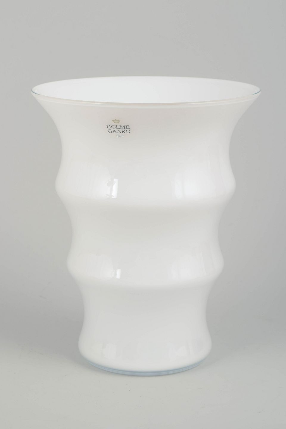 Elegant mundblæst vase i opalhvidt glas fra serien Karen Blixen, designet af Anja Kjær for Holmegaard. Karakteristisk bølget form med blød organisk silhuet. Original æske medfølger.