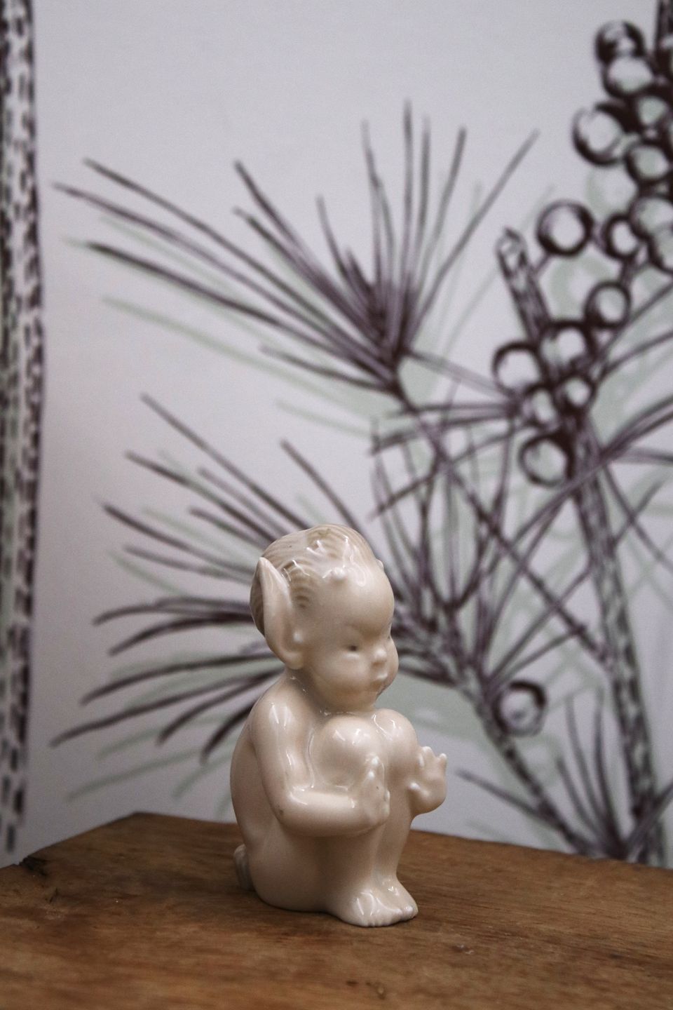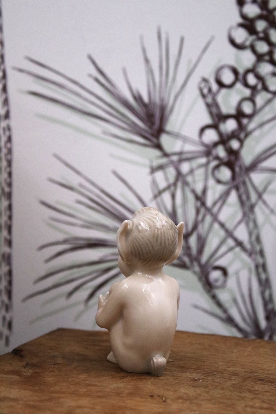 Sjælden porcelæns figur af Faun / Pan fra Royal Copenhagen , designet af Arno Malinowski (1899-1976) sølvsmed og designer bl.a. hos Georg Jensen. Højde: 6,6cm. Dekorationsnummer: 2249. 1.sort.