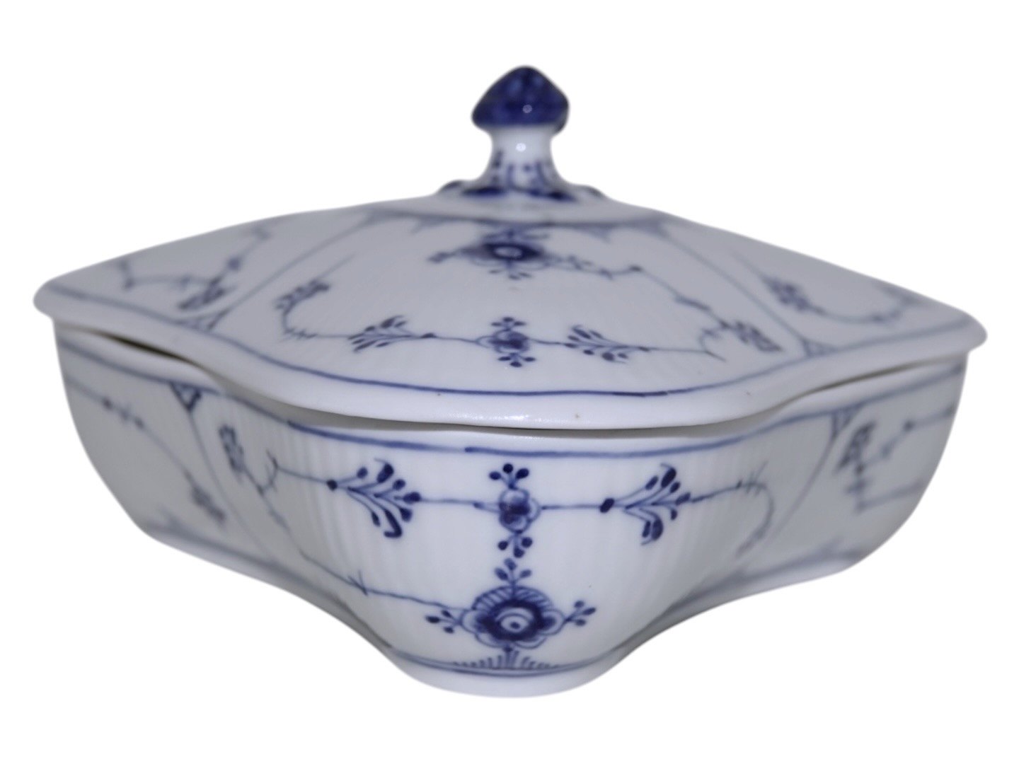 Royal Copenhagen Musselmalet Riflet, lille og sjælden trekantet skål med låg.