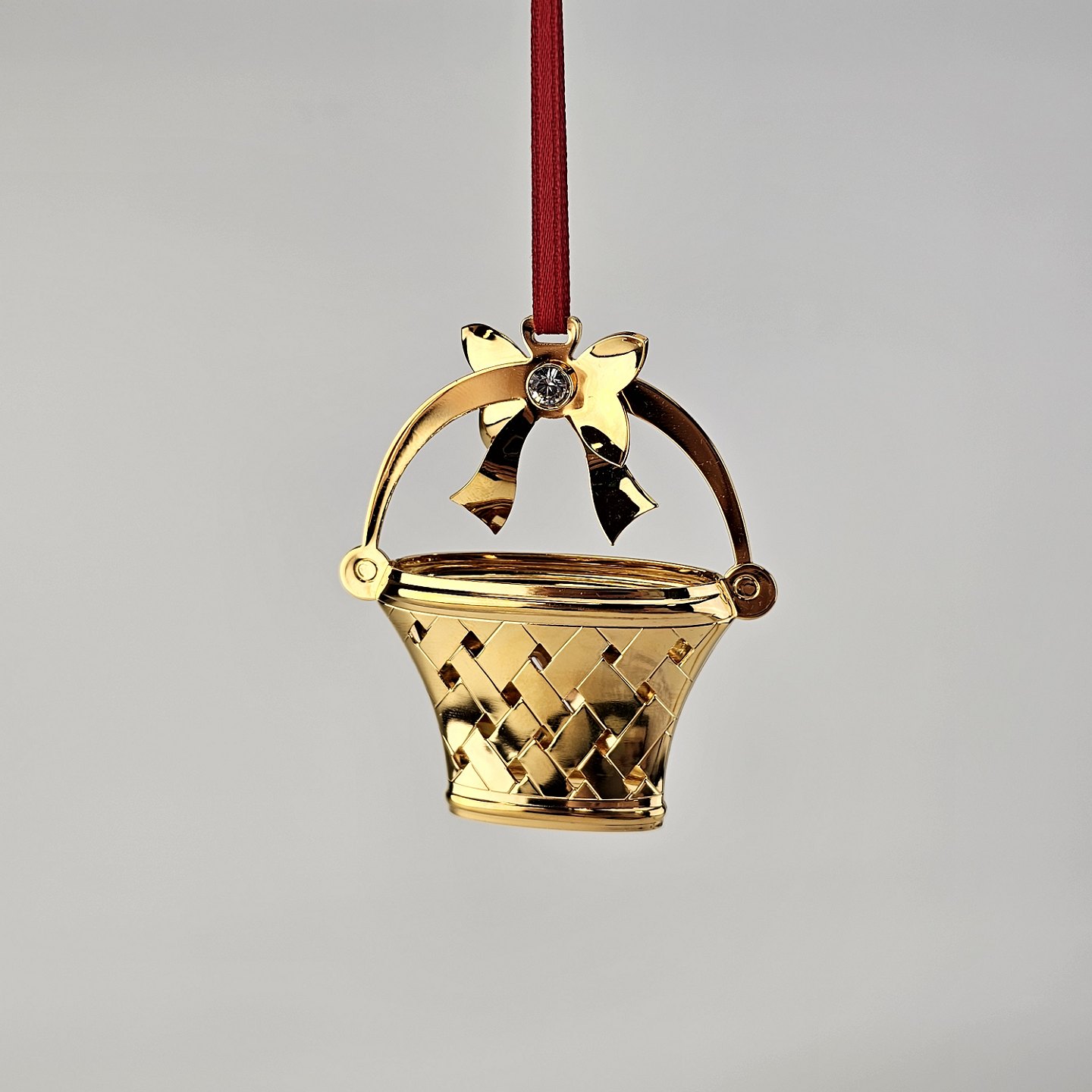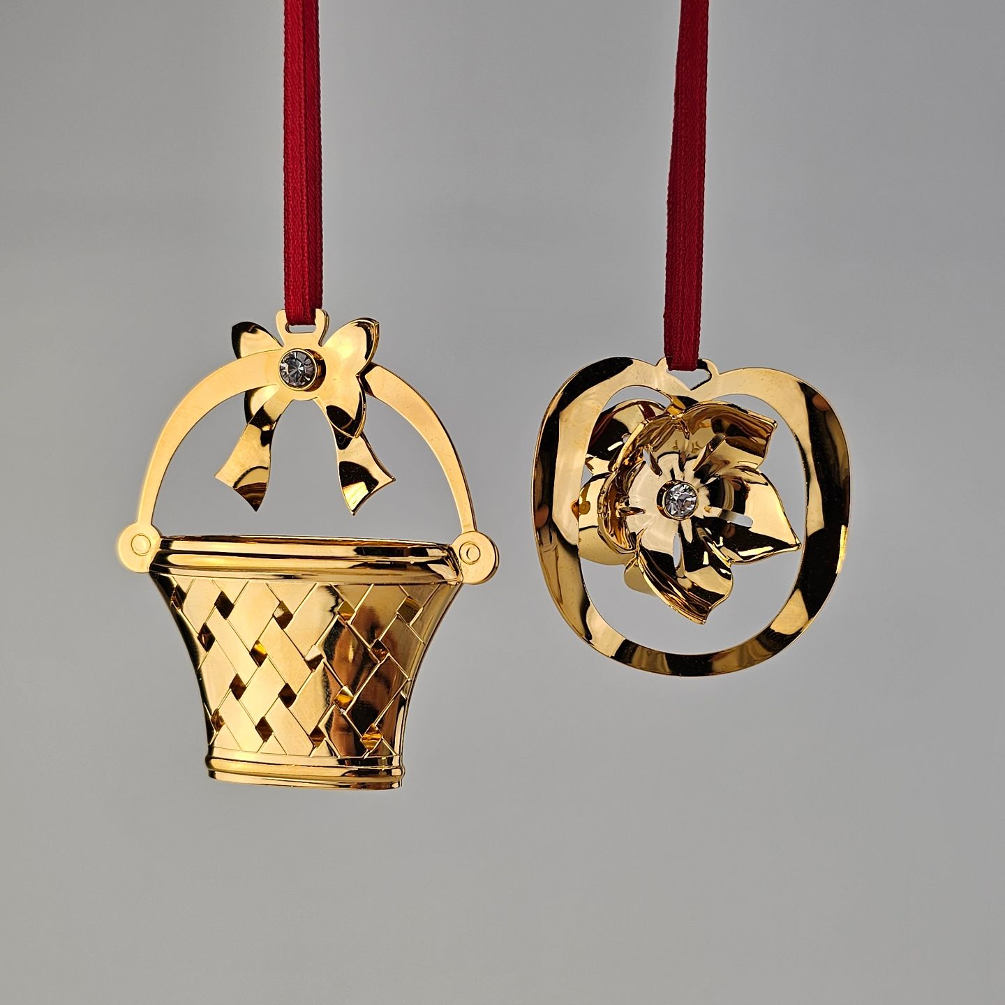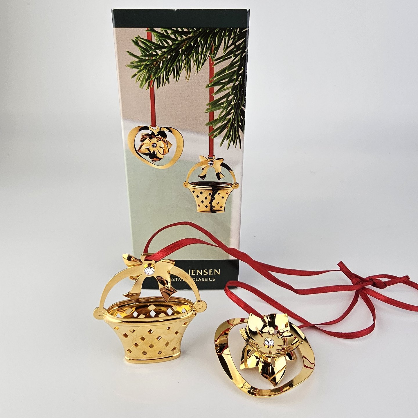 Text zugänglich auf Dänische: To juleornamenter til ophæng med form af en kurv og en julerose i messing forgyldt med 24 karat guld
